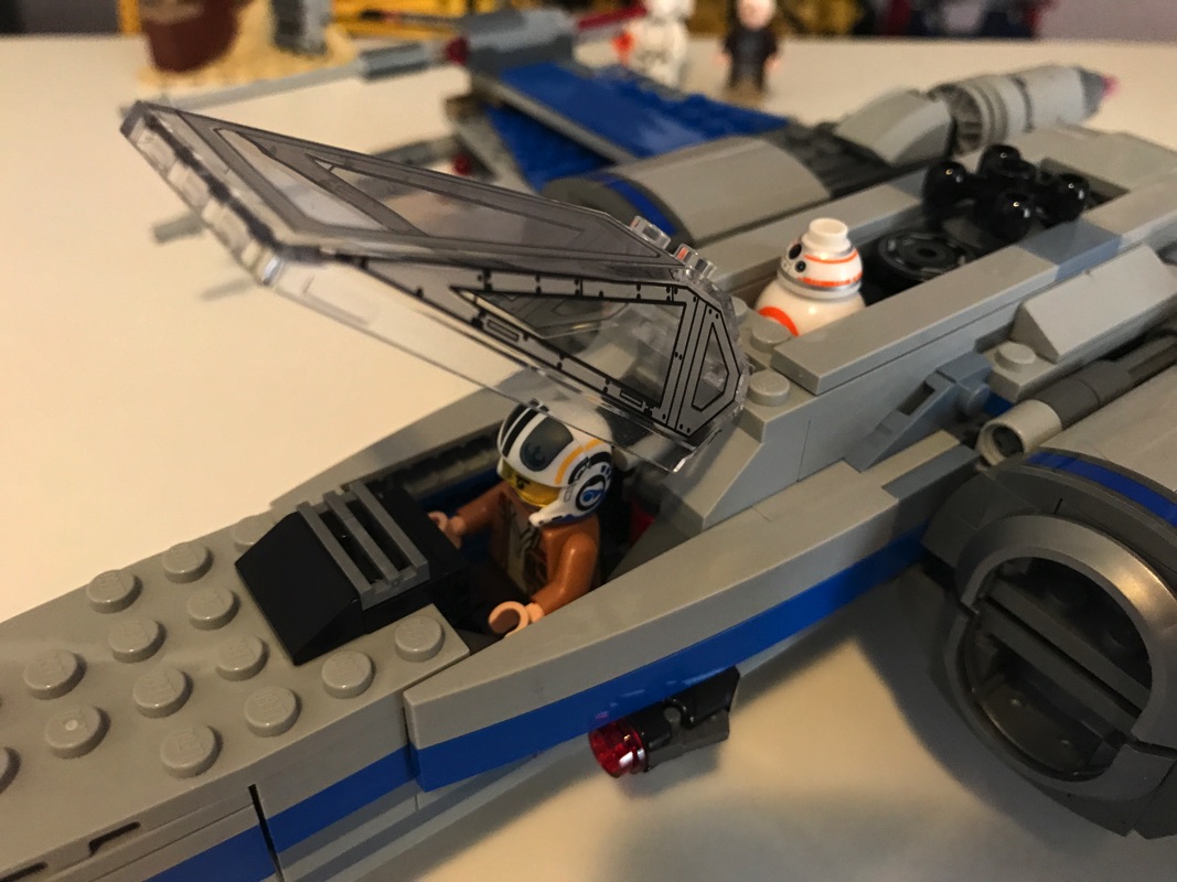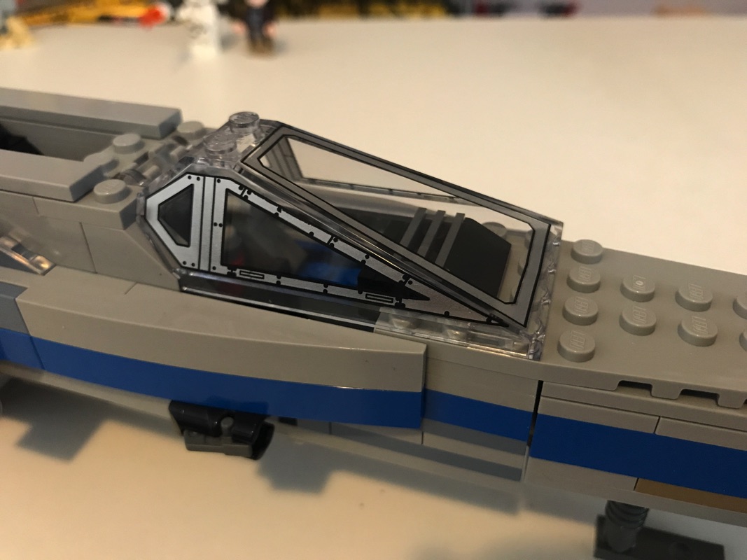La troisième étape nous permet de terminer le « corps » de notre vaisseau. Ainsi, on termine le système permettant l’ouverture des ailes, on vient assembler la verrière (tampographiée sur toutes les faces utiles, il est bon de le préciser), et habiller l’ensemble de tiles et autres slopes venant habiller le X-Wing de manière convaincante. On ajoute également les trains d’atterrissage (celui de devant est rétractable), sur notre modèle qui était devenu un peu instable ;). On assemble le module d’hyper-propulsion qui vient prendre place à l’arrière du vaisseau et qui est amovible. Enfin, c’est également dans cette étape que le fameux droïde BB-8 vient prendre sa place à l’arrière de la cabine de pilotage.