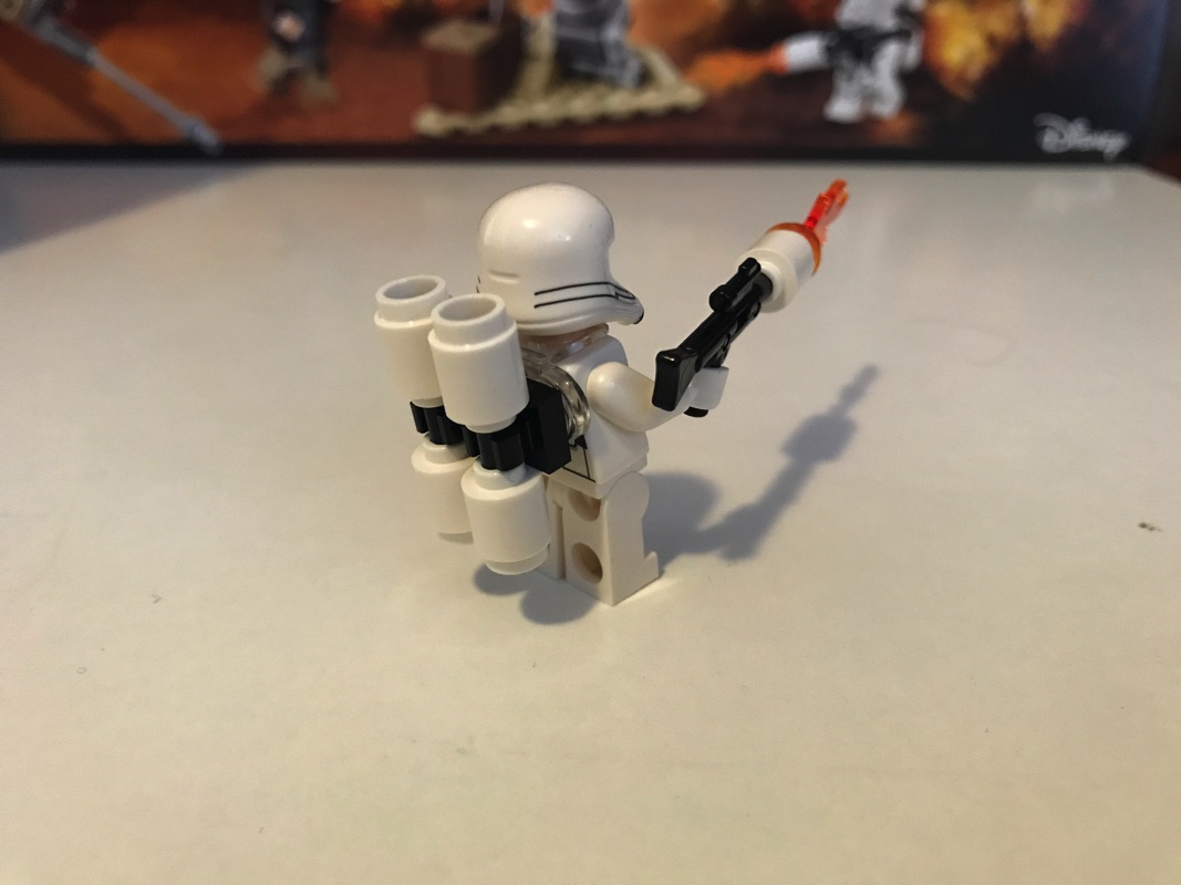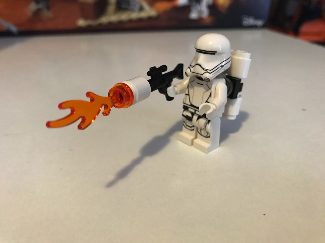 Dès l’ouverture de la boîte, Lego nous simplifie la tâche : 5 sachets, numérotés de 1 à 5, pour autant d’étapes principales visant à construire notre X-Wing. On commence l’assemblage par 2 minifigures , représentant Lor San Tekka et un Flametrooper du 1er ordre. Double visage pour le premier, pas pour le second mais de toute façon planqué sous un casque. Le lance-flammes est impressionnant, par rapport à la taille du personnage.