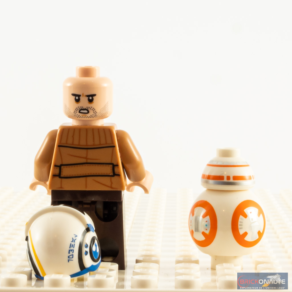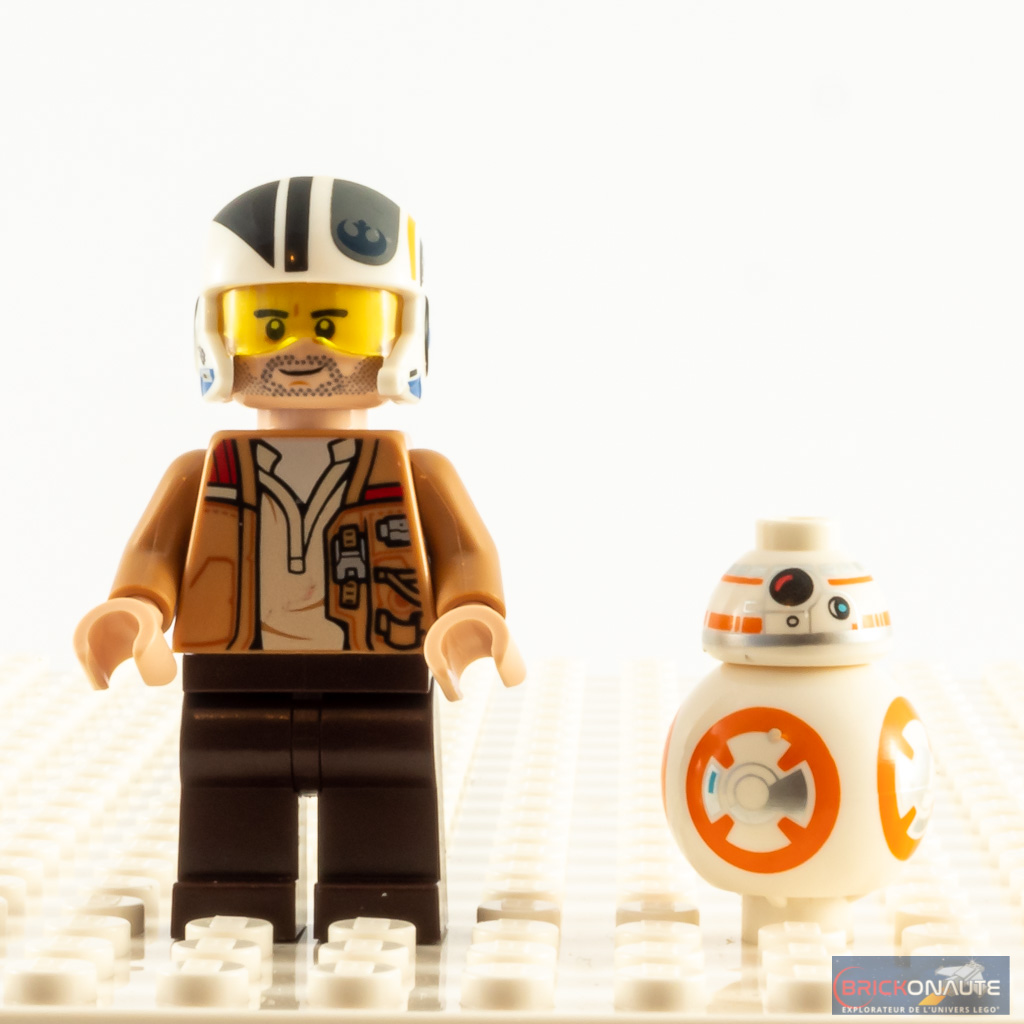 L’une des premières réflexions que je me suis faites, c’était de me dire que dans ce style de set les minifigs étaient vraisemblablement sans grand intérêt. Et bien ce n’est pas du tout le cas : Poe Dameron nous est proposé dans une version inédite pour le moment. Le torse et le casque sont, à l’heure où j’écris ces lignes, exclusifs à cette petite boîte. Le torse est plutôt joli, avec la veste caractéristique du personnage ouverte sur son tee-shirt. Le casque tampographié est tout bonnement superbe avec sa visière et son micro intégrés. La minifig de BB-8 est plus commune.