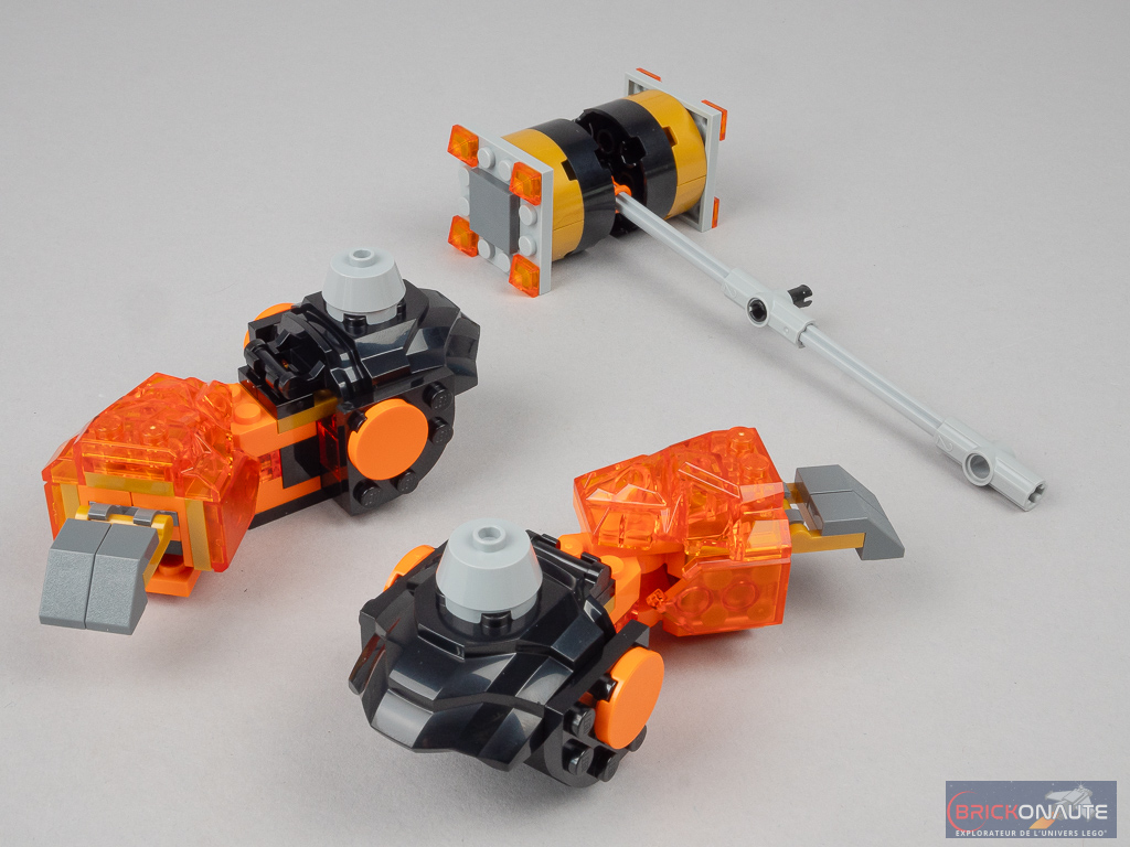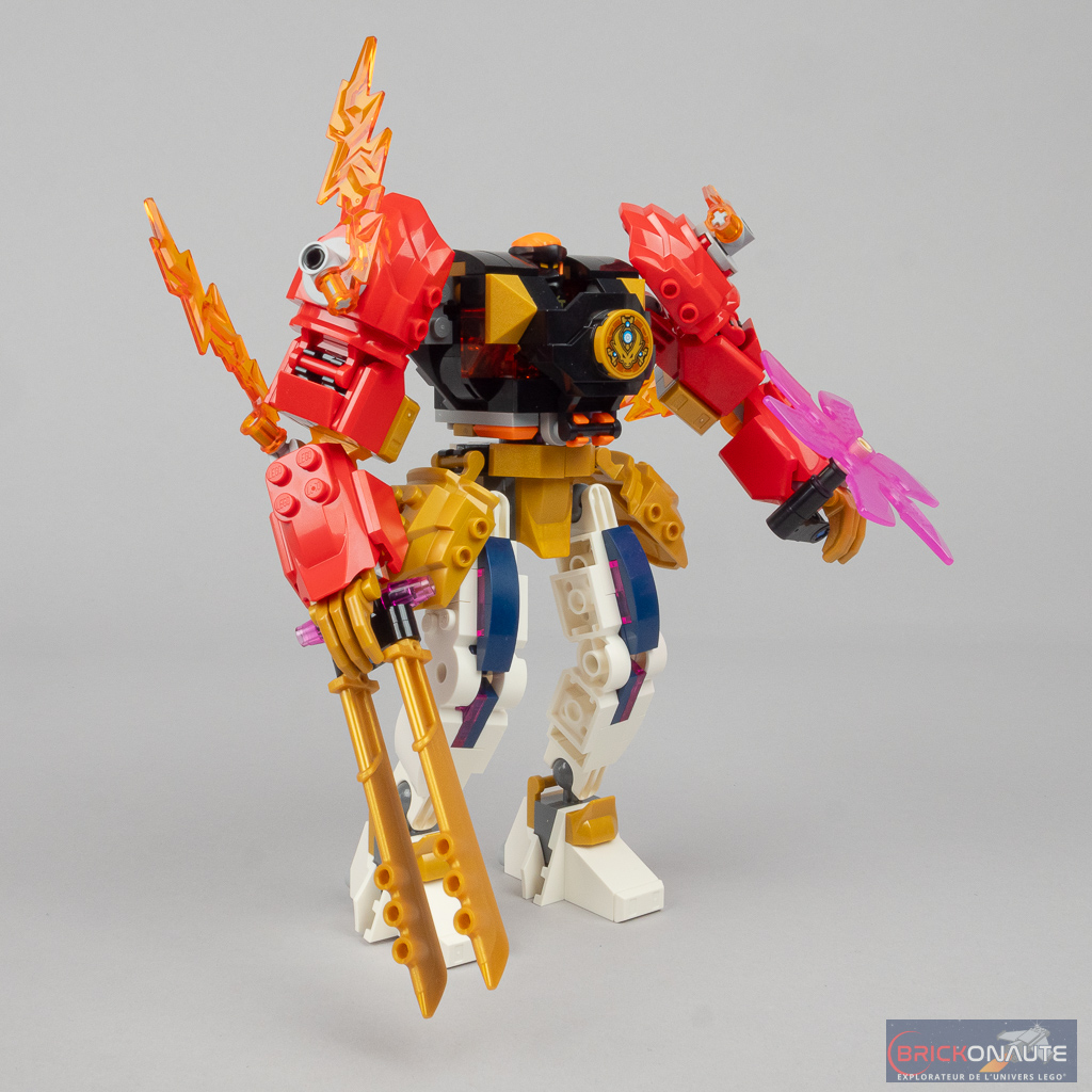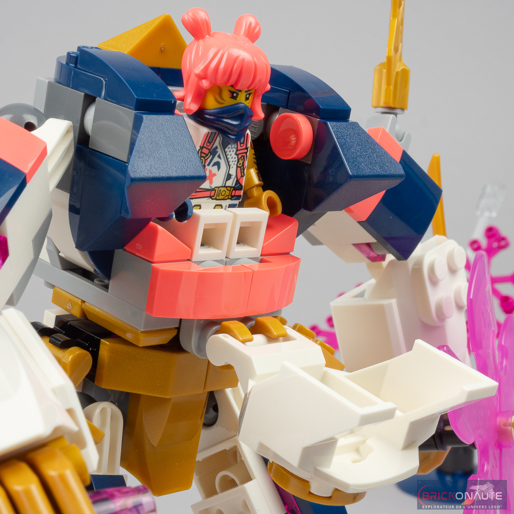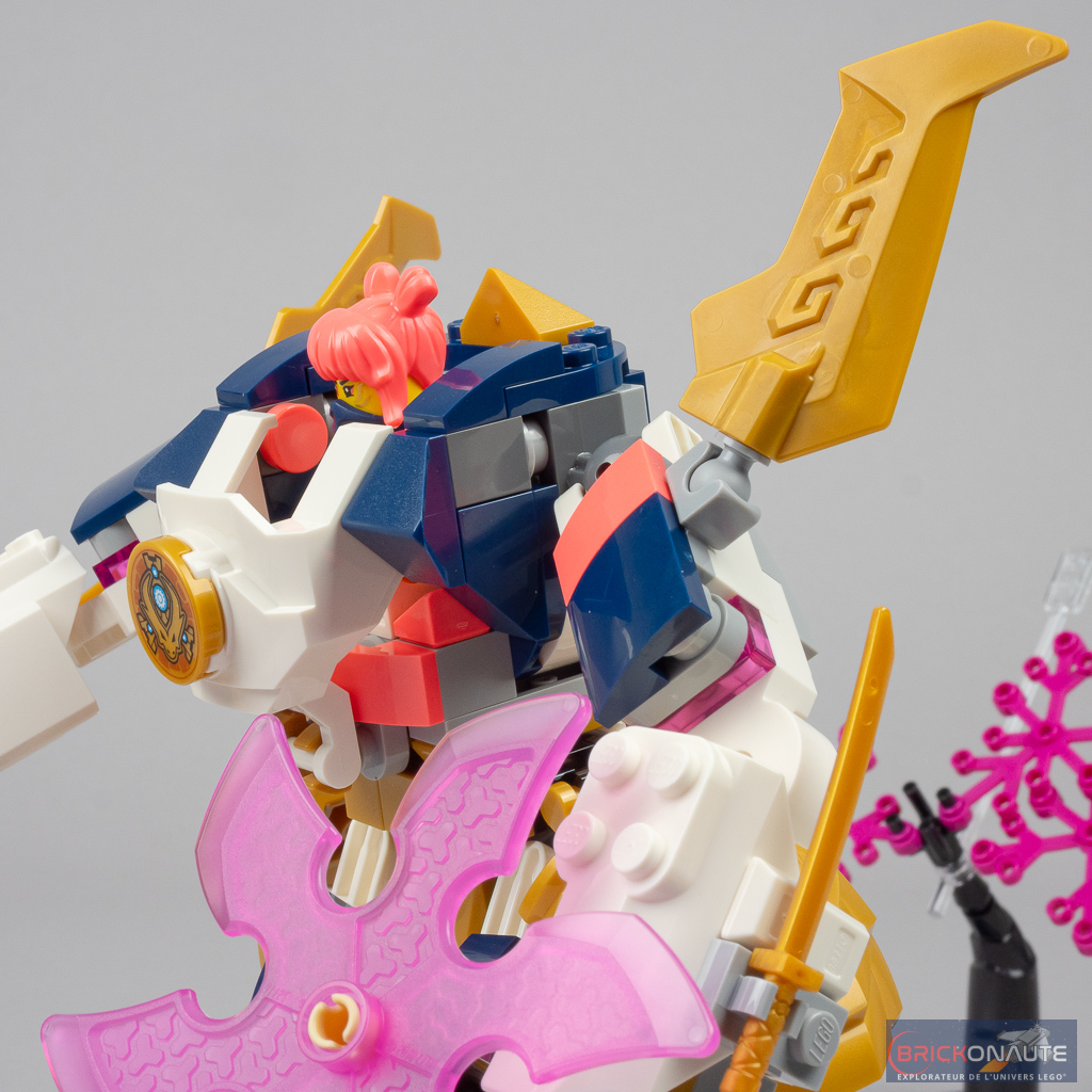 Pour ce qui est des robots, ils sont globalement bien réalisés avec deux bémols toutefois : celui de Sora (réf. 71807) paraît un cran en dessous des deux autres, et le robot piloté par le wolf mask warrior (dans le set 71808) est plutôt raté – LEGO devait chercher un moyen d’occuper un segment tarifaire un peu plus élevé avec cette référence mais il aurait été préférable, à mon avis, de proposer quelque chose de plus consistant (quitte à ce que ce soit un peu plus cher) plutôt que ce robot à moitié fini.