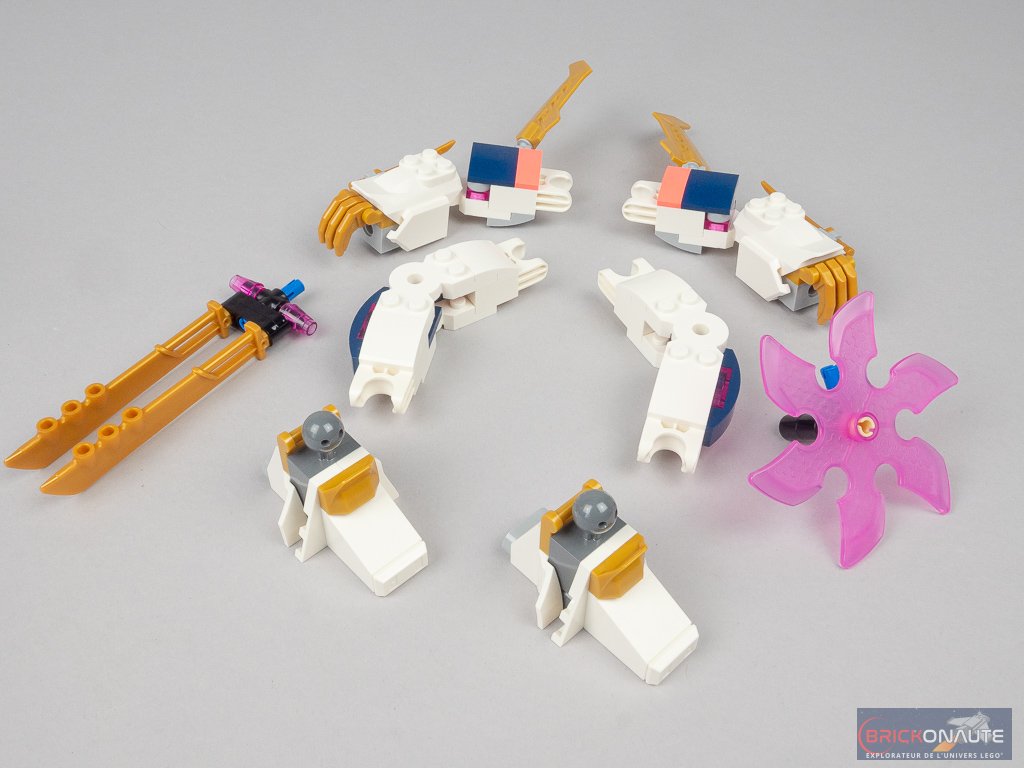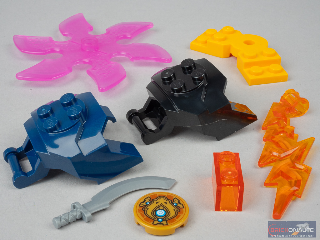 - quelques nouvelles couleurs dont, pour la première fois, une brique 2×1 en trans orange, un « éclair » dans cette même teinte, un gros shuriken rose translucide, une épée gris argenté, des épaulières dark blue et noires, et une pièce en angle bright light orange ;