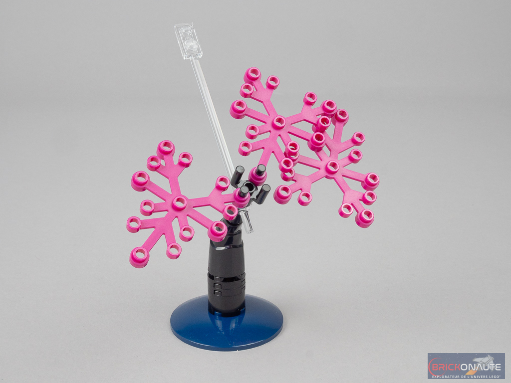 Je suis aussi moins convaincu par les couleurs retenues et la finition globale de l’ensemble qui aurait probablement mérité plus de soin. Par contre, j’apprécie le fait d’avoir deux armes bien différentes avec une double épée dorée et un gros shuriken rose translucide.