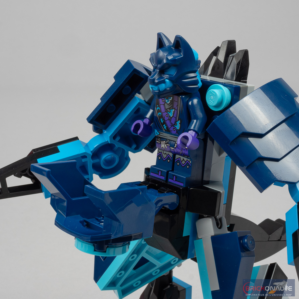 Du côté des minifigs, on trouve ici Cole dans sa tenue « mech », et un wolf mask warrior (guerrier au masque de loup) avec des épaulettes dark blue – c’est le seul à en disposer parmi les différents exemplaires de cette minifig à retrouver dans les autres sets.