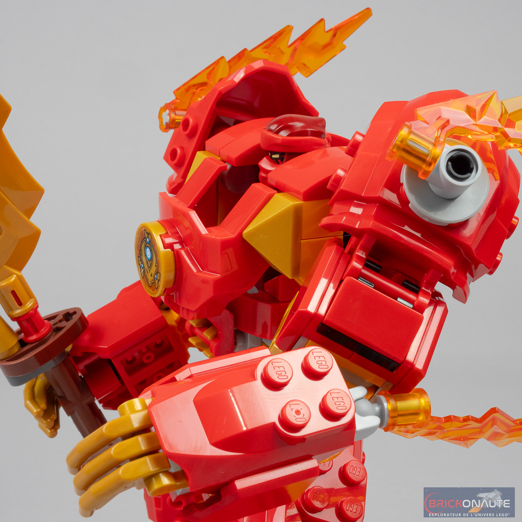 À l’instar du robot de Cole, celui-ci en impose avec ses jambes et ses épaules habilement décorées de grandes « coques » rouges, et ses jolis éléments de détail trans orange au niveau des bras. J’aime beaucoup également l’énorme épée dorée avec laquelle il se bat. Tout ça pour dire que le méchant de service n’a pas beaucoup de chances de s’en sortir en un seul morceau !