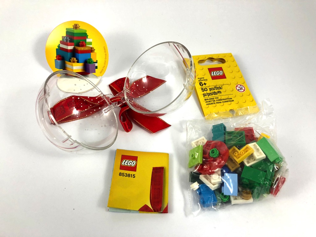 Les deux décorations se présentent de la même manière : une boule transparente dans laquelle se trouve un carton avec une photo du modèle construit, un sachet de pièces, et une notice d’instructions pliée. Cette boule est maintenue fermée par un ruban rouge orné de briques LEGO et deux morceaux de scotch, le tout est accroché sur un présentoir avec une grande « étiquette » jaune. À noter que le noeud est cousu : impossible de le défaire.