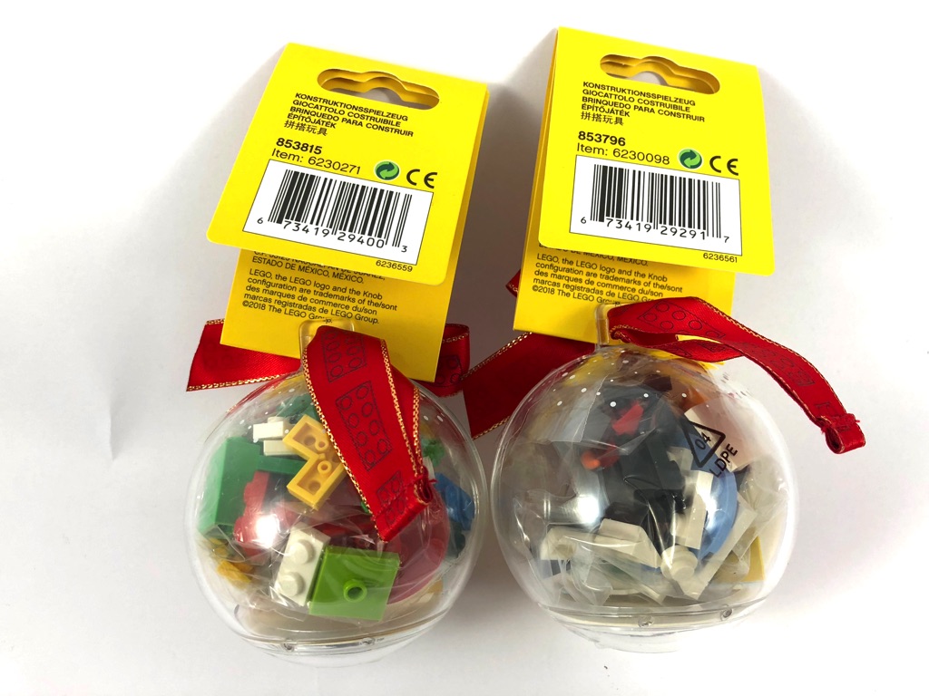 Les deux décorations se présentent de la même manière : une boule transparente dans laquelle se trouve un carton avec une photo du modèle construit, un sachet de pièces, et une notice d’instructions pliée. Cette boule est maintenue fermée par un ruban rouge orné de briques LEGO et deux morceaux de scotch, le tout est accroché sur un présentoir avec une grande « étiquette » jaune. À noter que le noeud est cousu : impossible de le défaire.