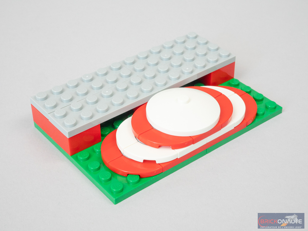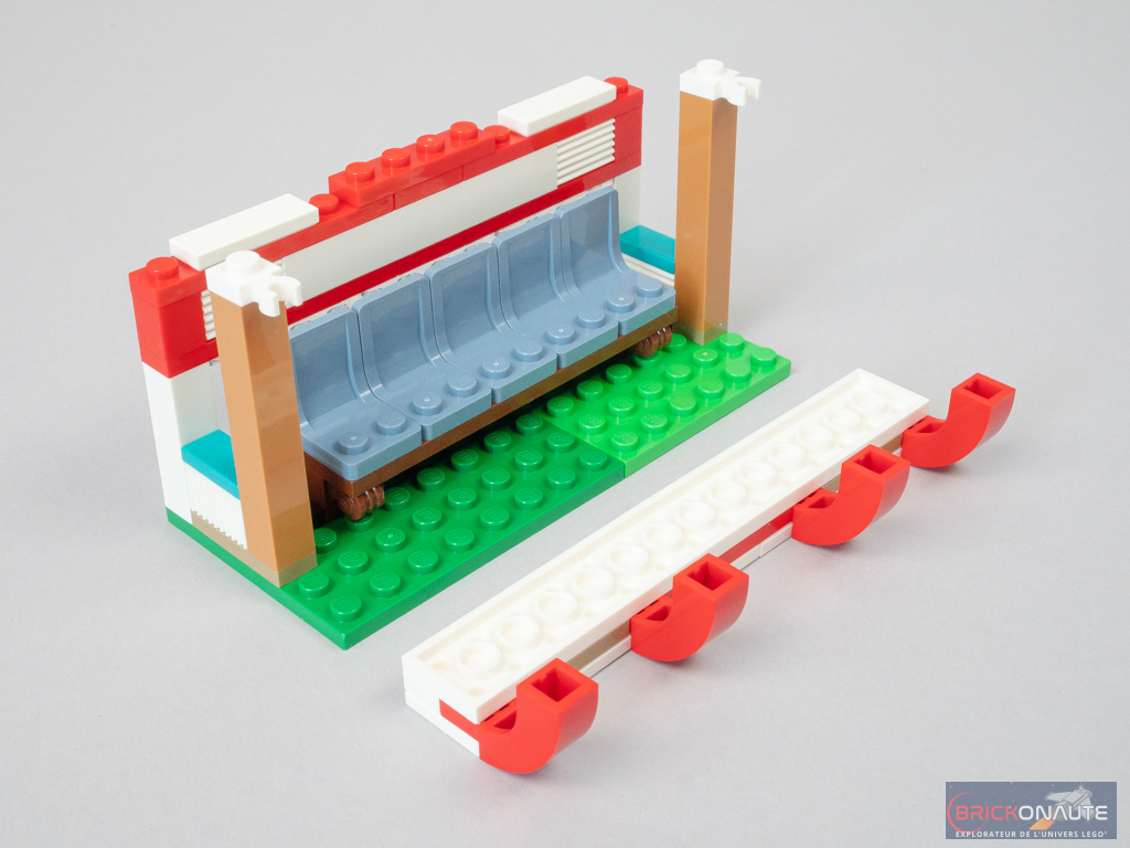 Enfin, les sachets portant le numéro 6 permettent l’assemblage des 3 constructions « accessoires ». On assemble ainsi un petit morceau de terrain avec quelques cônes d’entraînement et une caisse pour les gourdes, un banc de touche (aux sièges trop rapprochés pour pouvoir y asseoir toute l’équipe…), et un podium avec des marches plutôt jolies en forme de demi-cercle.