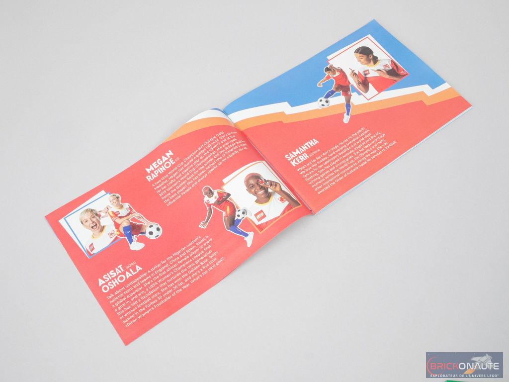 À l’intérieur, nous trouvons 12 sachets de pièces numérotés de 1 à 6, 1 sachet non numéroté, et 4 grandes plates grises de 16×16 tenons. On trouve également 2 notices de 64 et 80 pages, et une planche de 12 autocollants. La première notice commence par une présentation des 4 joueuses : Megan Rapinoe (OL Reign), Yūki Nagasato (Chicago Red Stars), Asisat Oshoala (FC Barcelone) et Samantha Kerr (Chelsea).