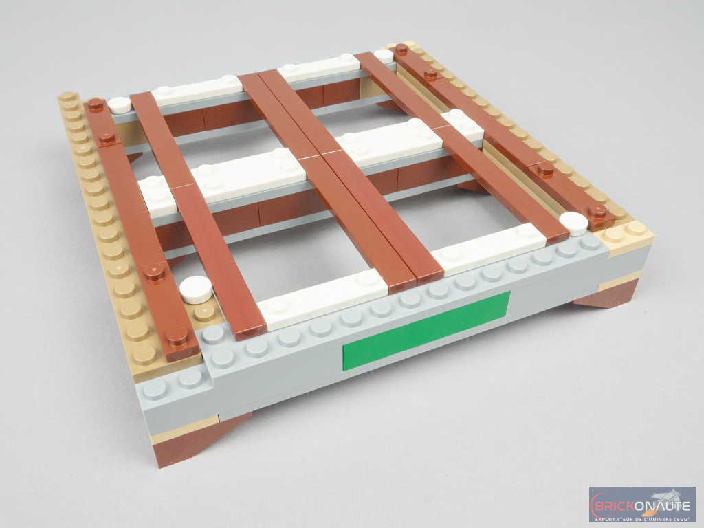 On ajoute à nouveau quelques détails dans le jardin, puis on assemble une sous-construction qui formera la structure retenant le château. Les couleurs marron et blanc rappellent celles que l’on peut voir à l’intérieur de l’édifice.