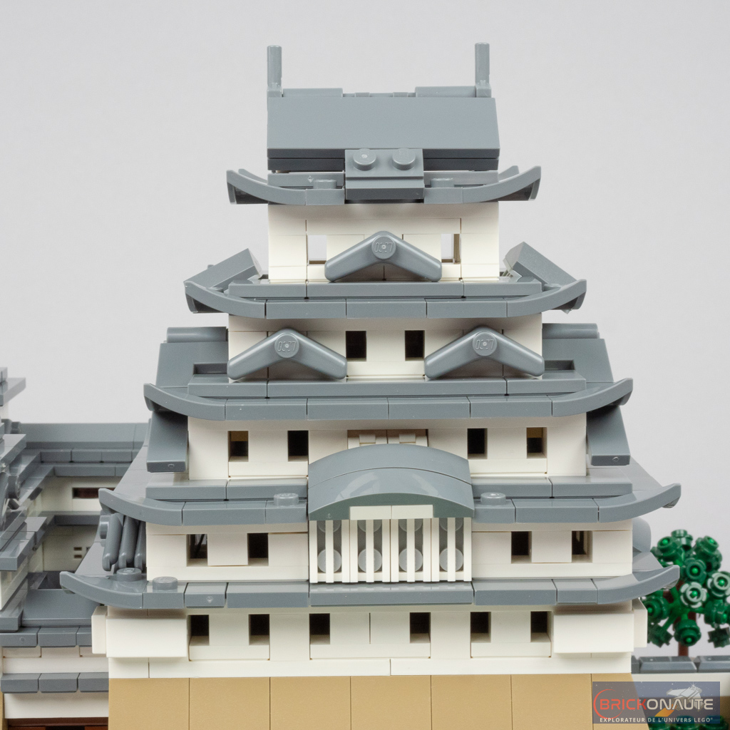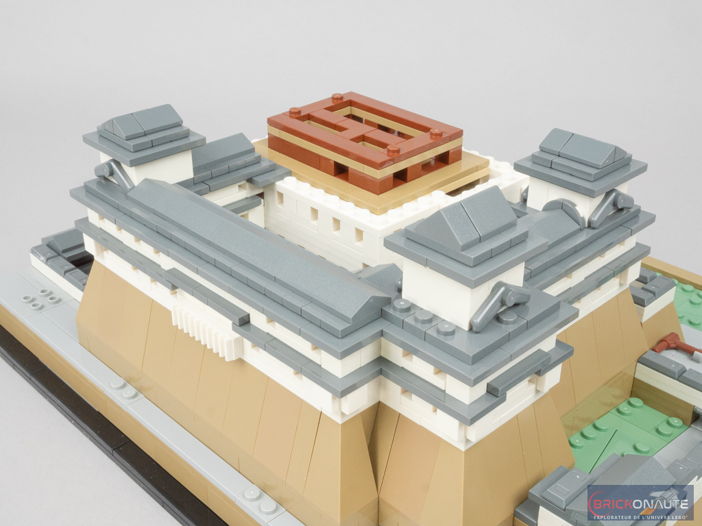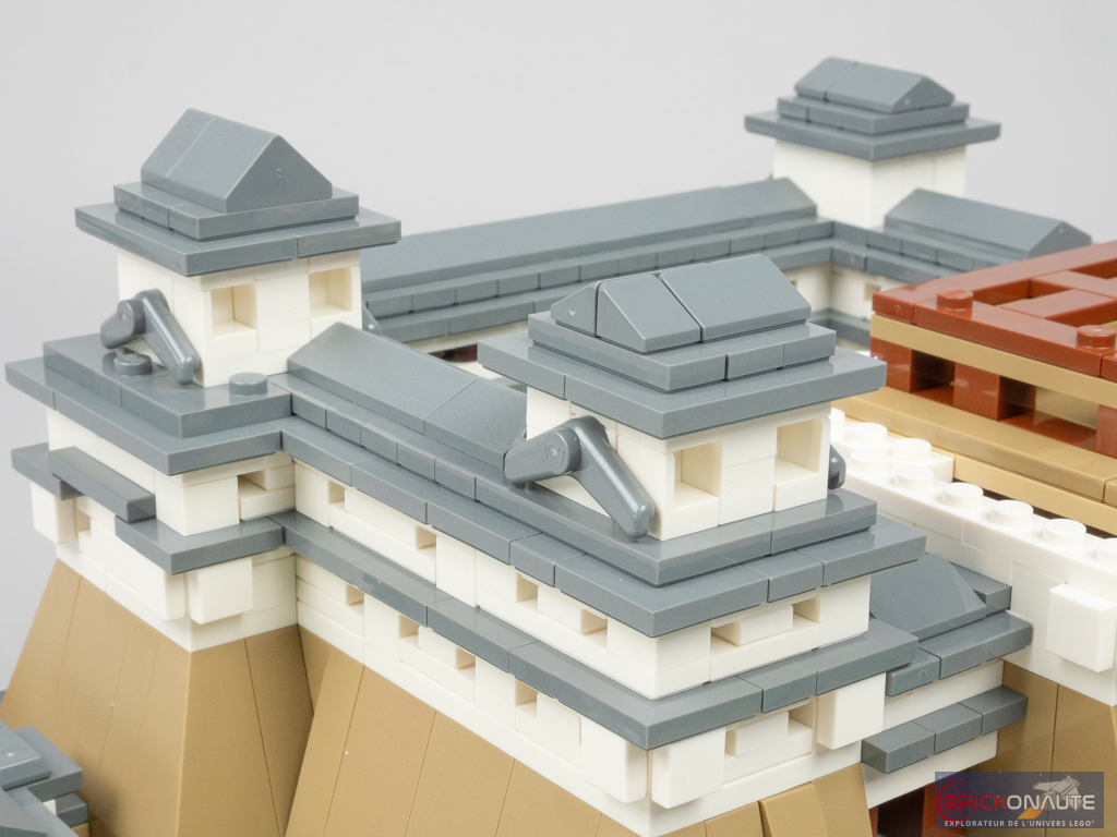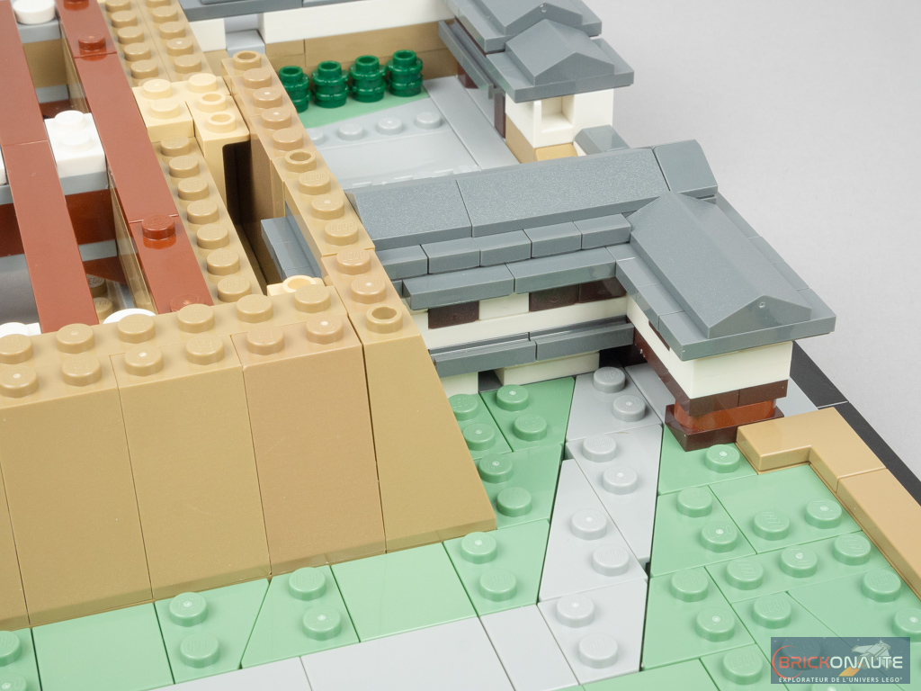 Concernant le château lui-même, là encore le design est plus que satisfaisant avec des proportions qui semblent justes, et une utilisation très intelligente des éléments LEGO pour former les différentes ouvertures ou les toitures. Des boomerangs se retrouvent ainsi utilisés pour former des toitures, et des patins à roulettes sont transformés en frontons pour certaines portes. Des jumpers disposés un peu partout permettent d’obtenir les décalages d’un demi-tenon. L’aspect presque organique du « Château du Héron Blanc » comme le surnomment les japonais est particulièrement bien retranscrit.