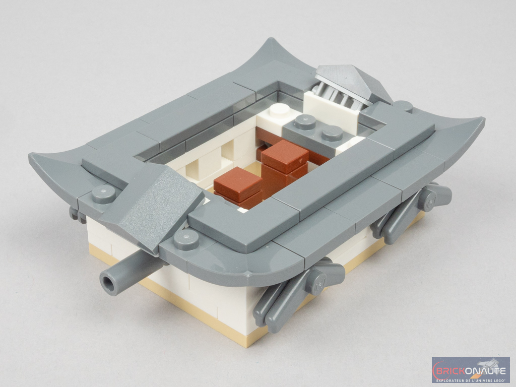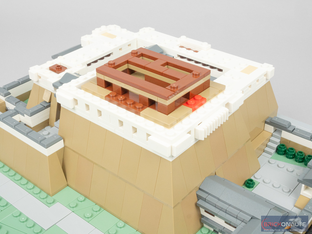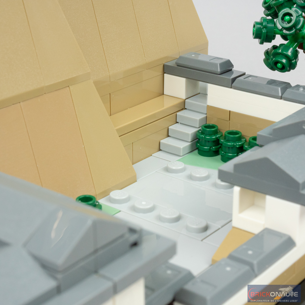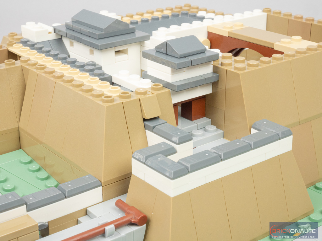Concernant le château lui-même, là encore le design est plus que satisfaisant avec des proportions qui semblent justes, et une utilisation très intelligente des éléments LEGO pour former les différentes ouvertures ou les toitures. Des boomerangs se retrouvent ainsi utilisés pour former des toitures, et des patins à roulettes sont transformés en frontons pour certaines portes. Des jumpers disposés un peu partout permettent d’obtenir les décalages d’un demi-tenon. L’aspect presque organique du « Château du Héron Blanc » comme le surnomment les japonais est particulièrement bien retranscrit.