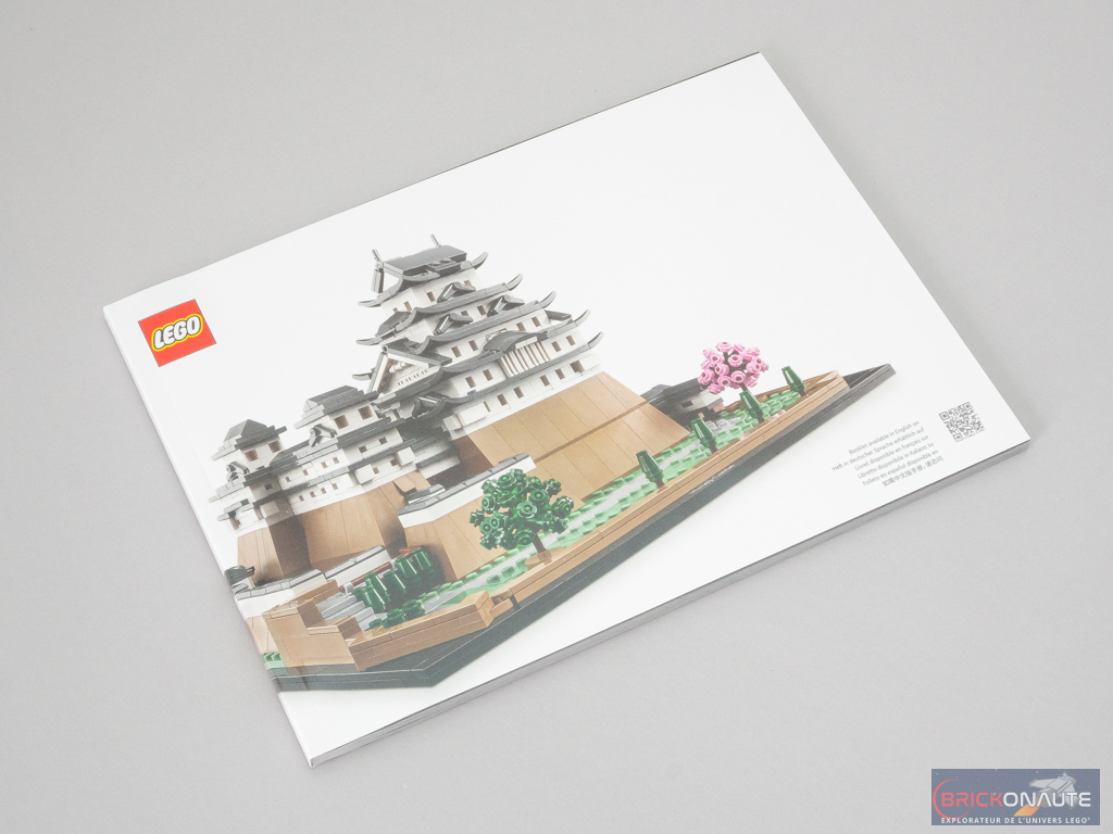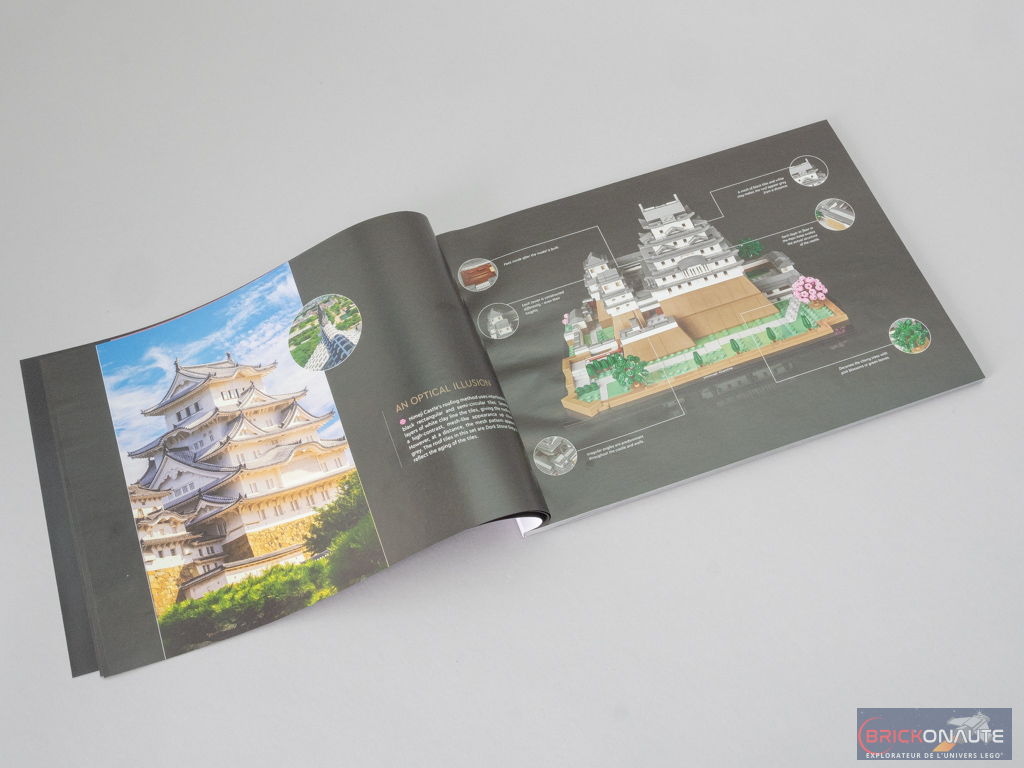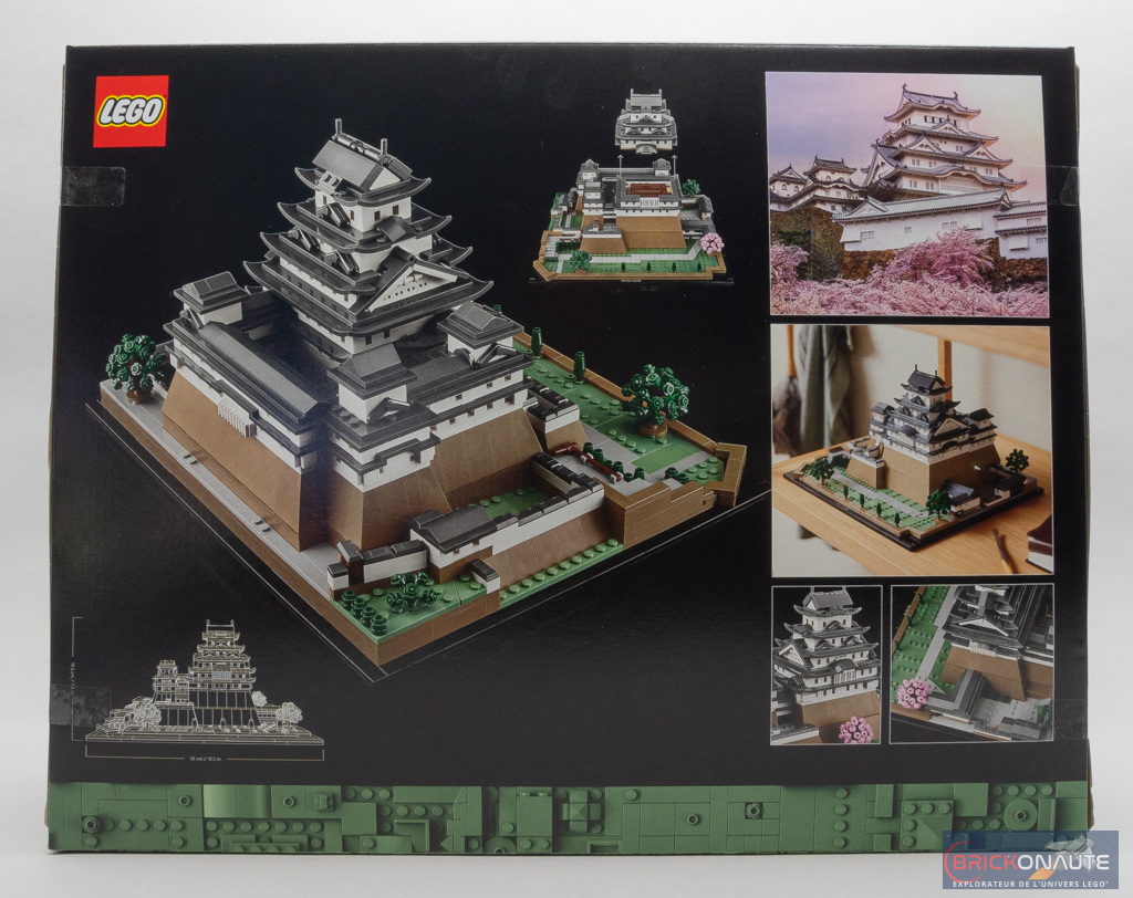 La boîte reprend les codes habituels des sets dédiés aux adultes : le set présenté sur un fond noir, et une bande colorée en partie basse avec les principales informations sur le set. Le nom du château est également écrit en japonais, au dessous d’une silhouette de ce dernier – j’aime ce genre de détails. Au dos de la boîte, on trouve plusieurs vues du château LEGO, et une du vrai situé à Himeji (姫路市, Himeji-shi), au sud de Honshū (la plus grande île du Japon).