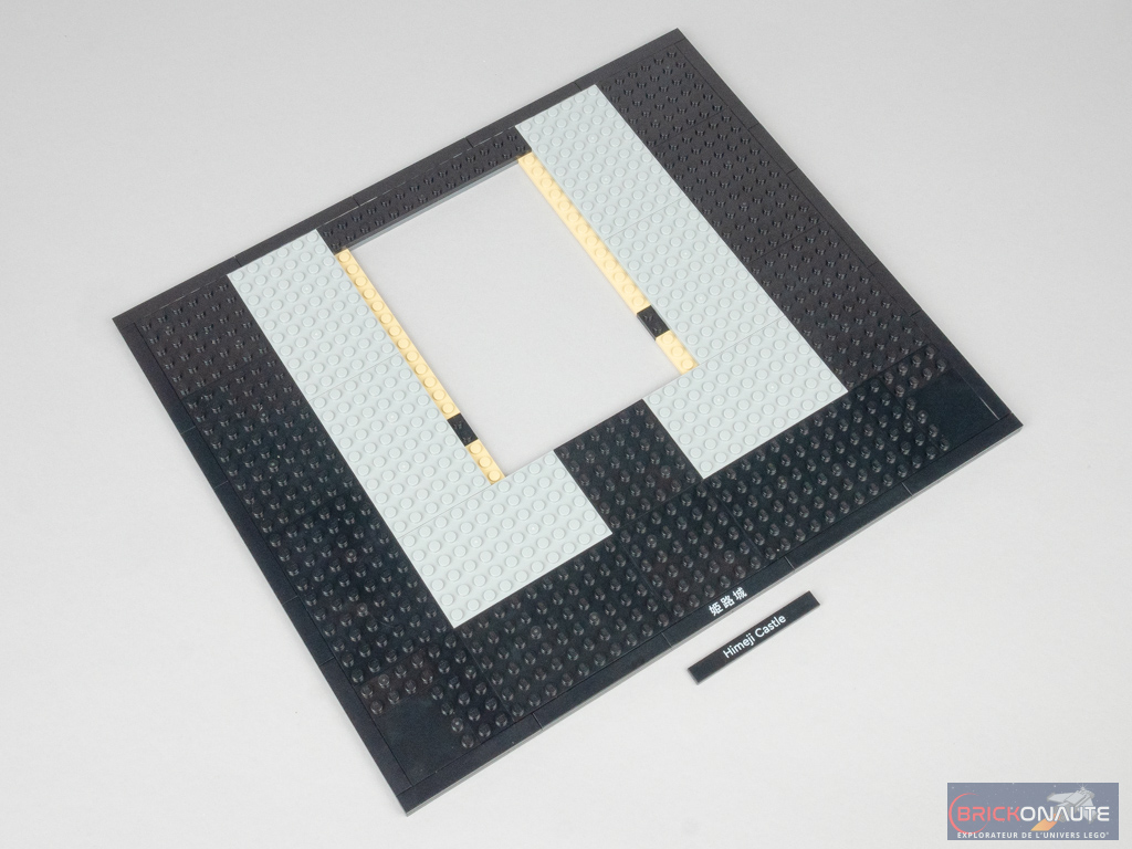 La première étape est très classique et dédiée à la base du set – on s’aperçoit que l’ensemble sera plutôt imposant : 32cm de large pour 27cm de profondeur. Sur cette base d’une épaisseur de 2 plates, on choisira de placer la tile tampographiée avec le nom du château en anglais ou en japonais.