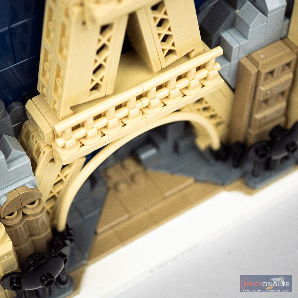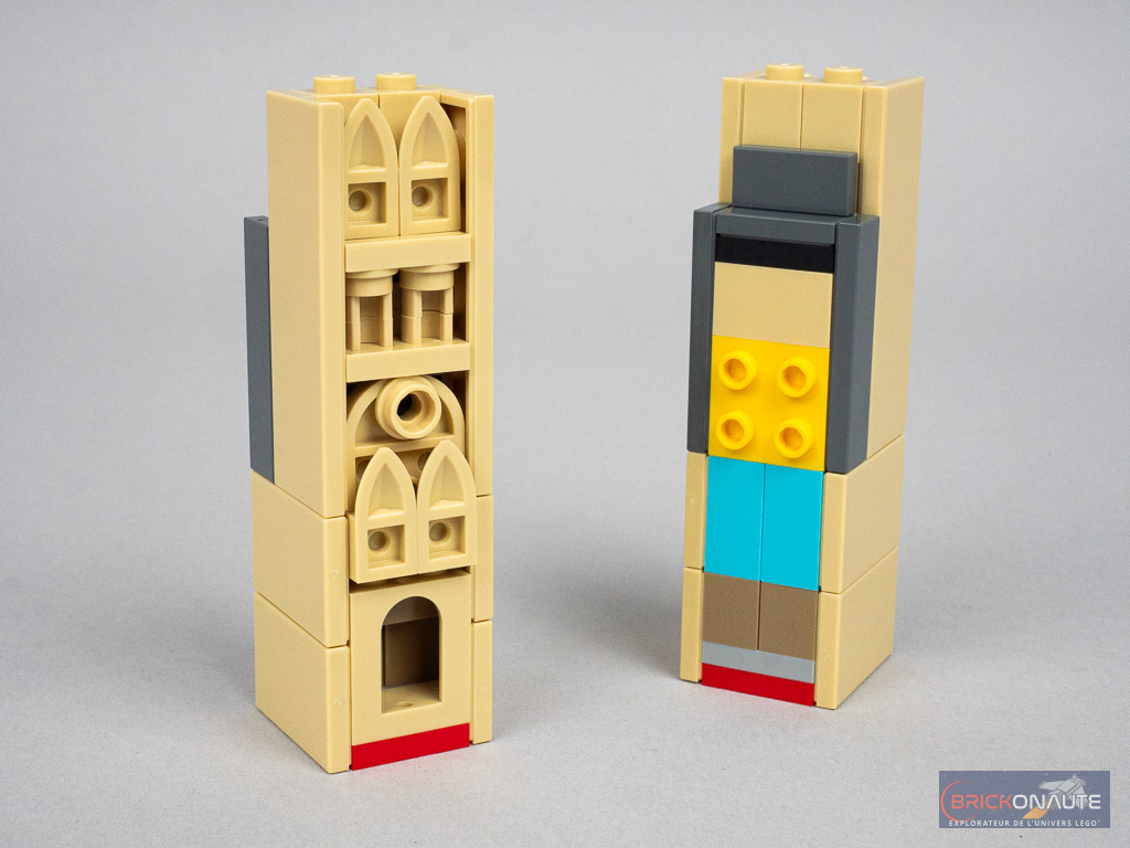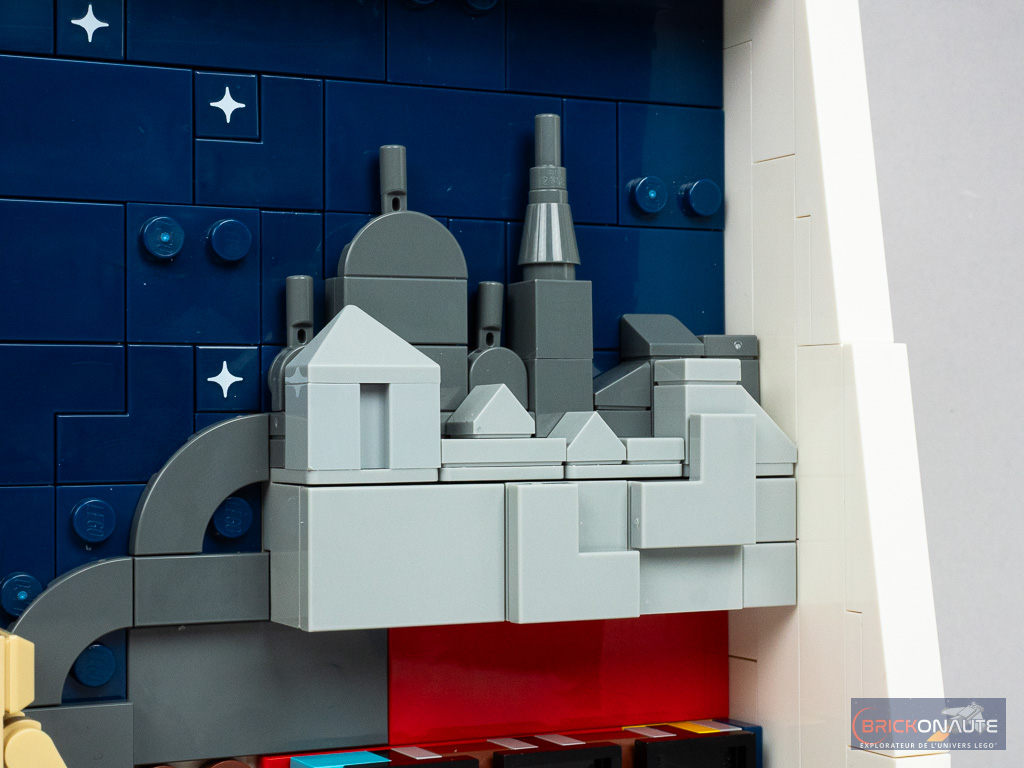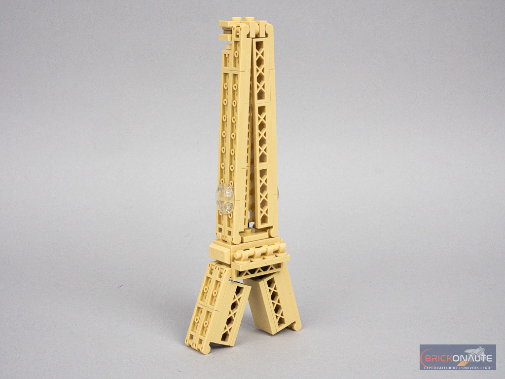 Hormis l’enjoliveur en question, on remarquera quelques détournements de pièces intéressants avec des clôtures pour les treillis de la Tour Eiffel, la face arrière des « dents » LEGO pour les arches de la cathédrale, ou des clips ouverts superposés pour former de petites tours. La pointe de la Tour Eiffel vient se bloquer dans une ouverture du cadre blanc.