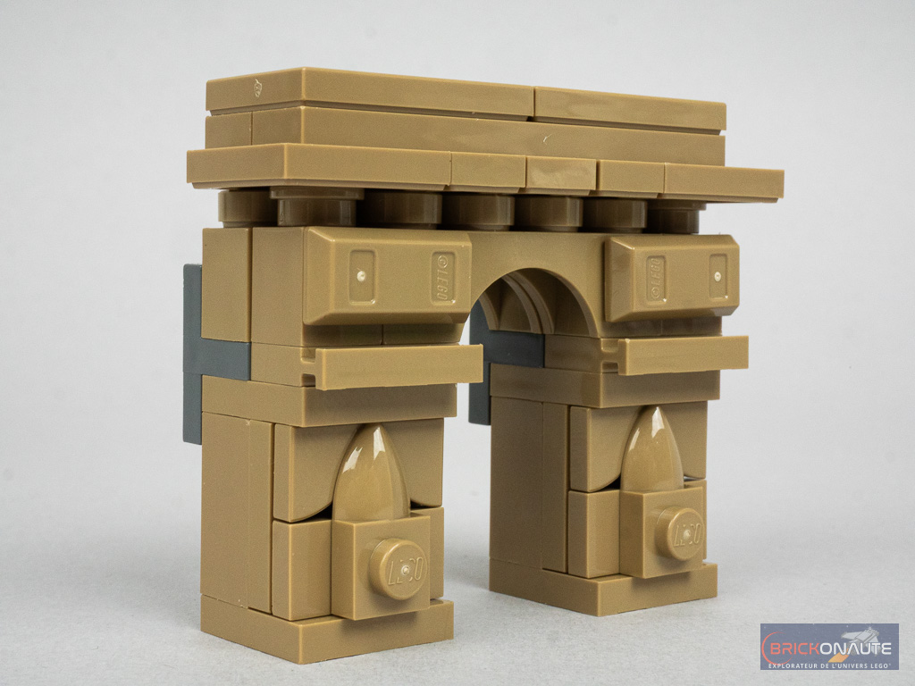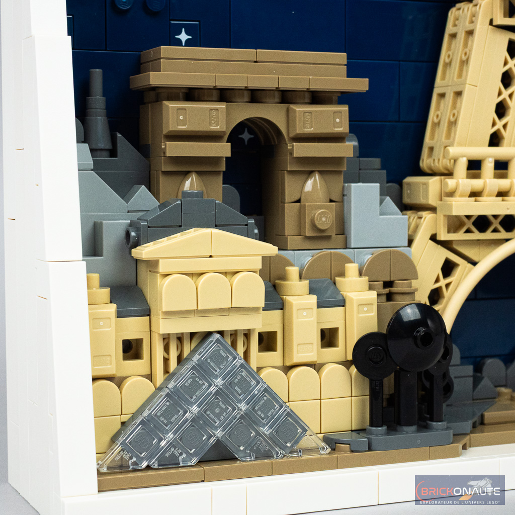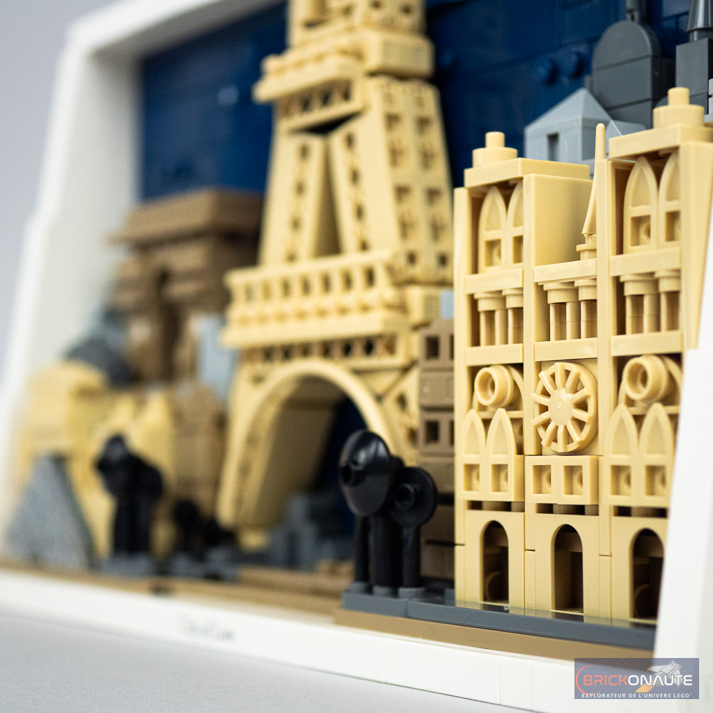 À sa gauche, on trouve le Louvre au premier plan avec une pyramide plate et derrière lui, dans un ton plus sombre comme pour forcer la perspective, l’Arc de Triomphe. Et à sa droite, c’est la cathédrale Notre-Dame de Paris surmontée, dans le lointain, par Montmartre qui se résume à une silhouette grise. Les petits bâtiments gris clair, disposés un peu partout dans la construction, pourraient presque rappeler les toits de zinc de la capitale. Hormis Montmartre, tous ces bâtiments ont d’ailleurs déjà eu droit à leur interprétation « unitaire », sans oublier la skyline 21044 Paris sortie en 2019.