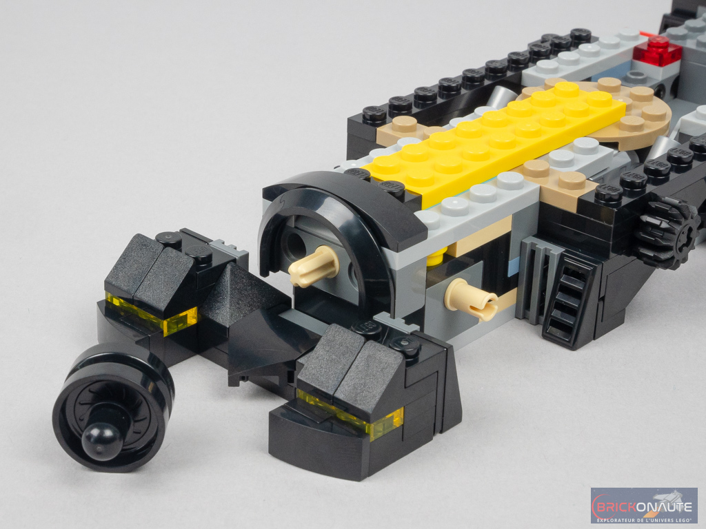 Un petit sous-ensemble est fixé à l’avant avec les deux phares jaunes translucides, puis on attache une jante noire à un pin pour représenter la turbine placée à l’avant de la voiture. On ajoute quelques éléments à l’arrière pour constituer le coffre et compléter le cockpit. On ajoute les feux arrières et les pots d’échappement (des jumelles reconverties), puis on s’occupe des passages de roue et des « ailes » arrières constituée de grandes slopes.