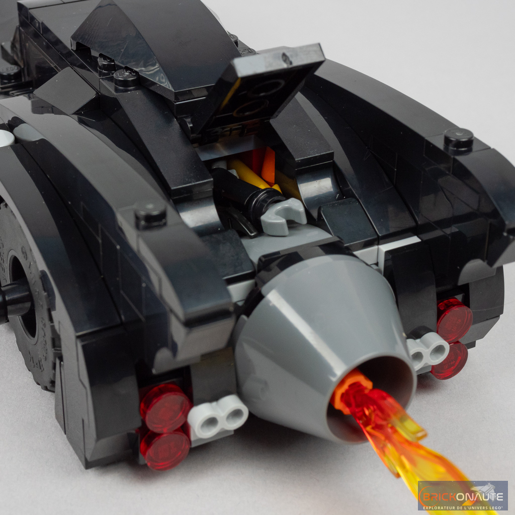 Du côté des fonctionnalités, une petite molette (qu’on pourra retirer facilement si on souhaite exposer la voiture) permet de faire « sauter » deux wedges et de dévoiler deux canons de mitrailleuse. Un système d’engrenage permet de faire tourner la flamme à l’arrière en faisant avancer la Batmobile. Et une petite trappe s’ouvre à l’arrière pour dévoiler un coffre dans lequel ranger les différents accessoires du Chevalier Noir. Évidemment, la partie supérieure du cockpit se retire facilement pour installer Batman aux commandes. Tout ça pour dire que la jouabilité me paraît très correcte, sans sacrifier au design général.