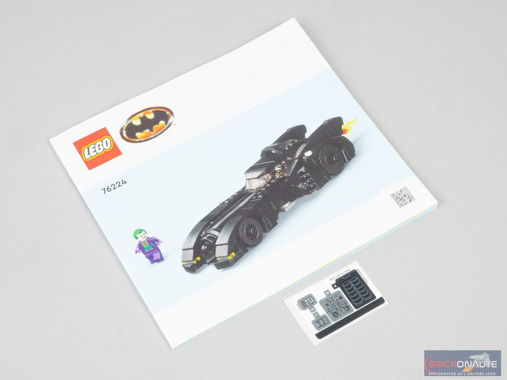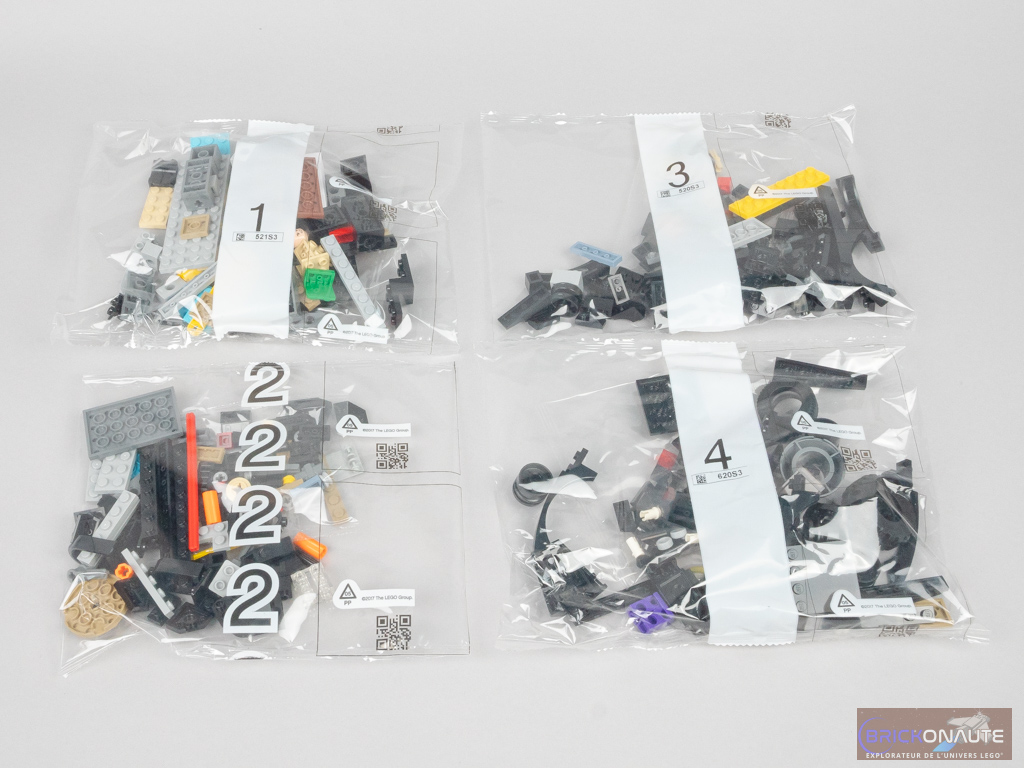 La boîte contient 4 sachets numérotés de 1 à 4, une notice d’instructions de 124 pages pour 144 étapes de construction, et une petite planche de 4 autocollants (dont 3 iront à l’intérieur).