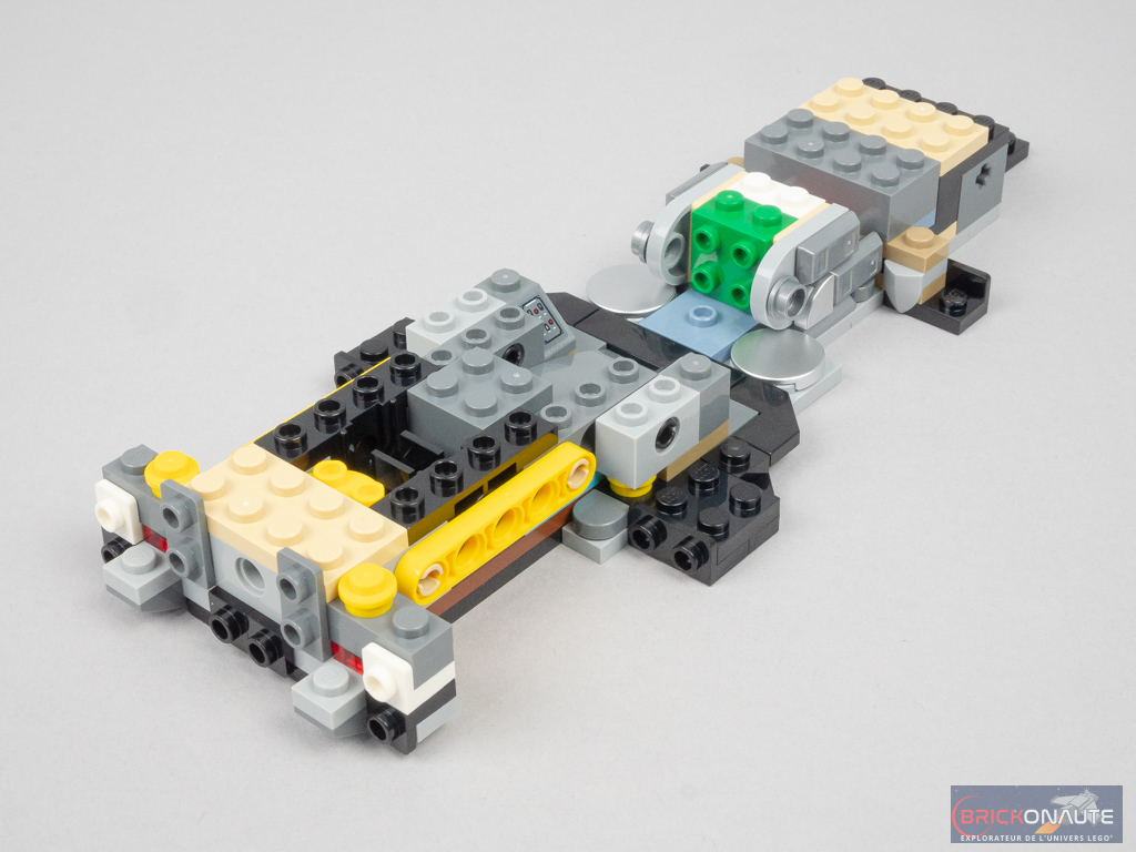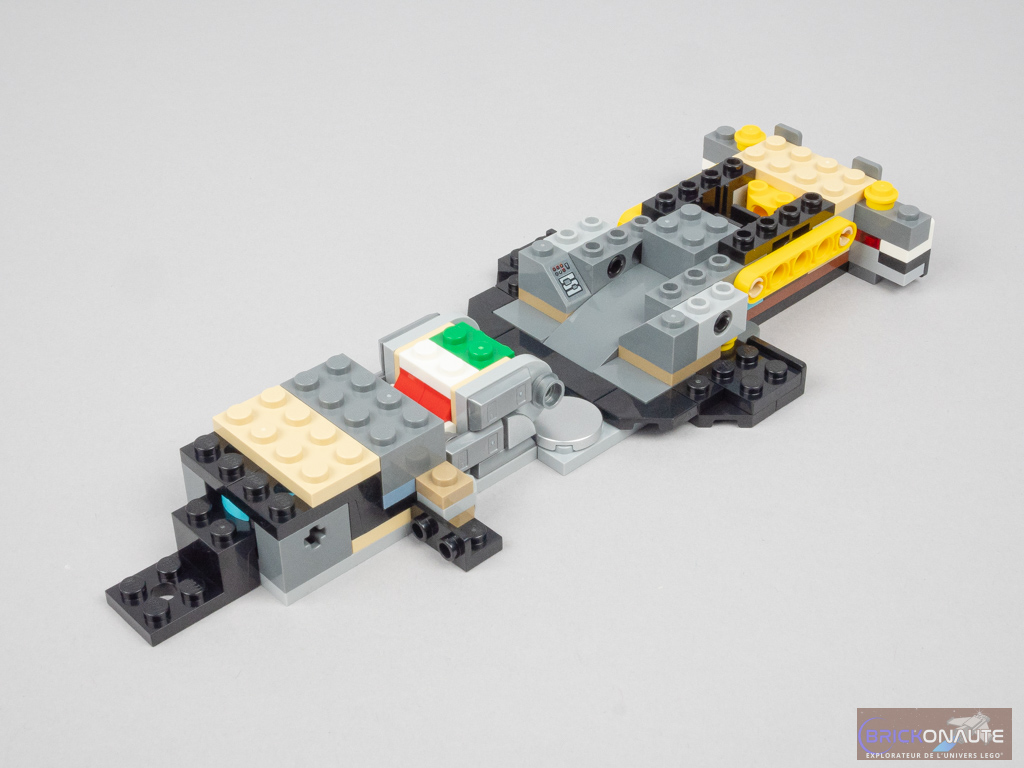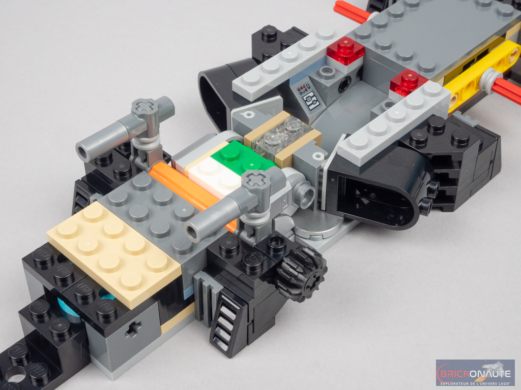 On repasse sur l’avant pour construire le « capot », les passages de roues et compléter la carrosserie (en couvrant notamment les mitrailleuses avec 2 wedges). On termine les passages de roues arrières, puis on s’occupe du cockpit avec deux vitres latérales fixées sur des briques SNOT et un petit pare-brise. On ferme le « coffre » avec une tile modifiée avec 2 clips, et on ajoute l’énorme réacteur central et la flamme bicolore. On termine avec un petit sous-assemblage pour le toit, puis les 4 roues dont la partie centrale du moyeu est décorée.