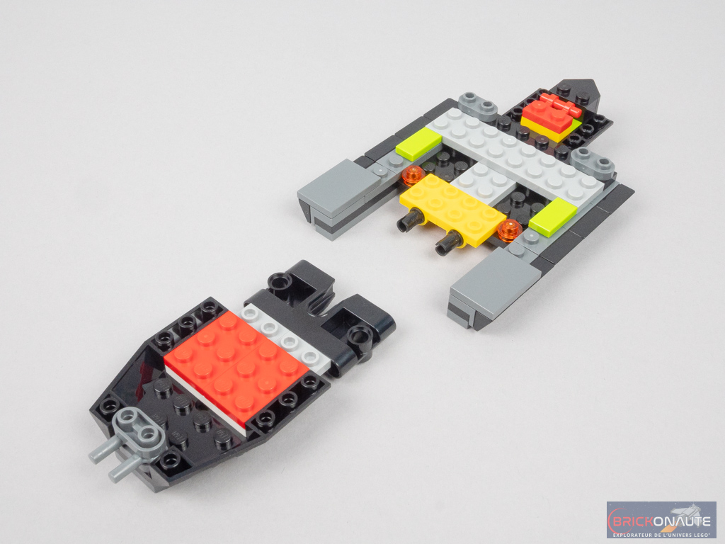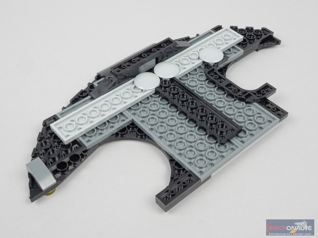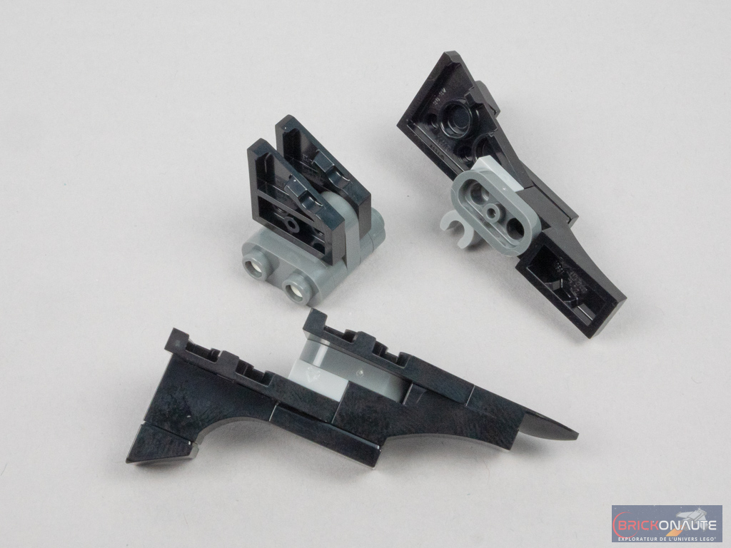 Les sachets de pièces portant les numéros 2 et 3 sont dédiés à la construction des ailes. Leur conception est très simple : il s’agit pour l’essentiel de superposer des plates et tiles noires et grises – les formes de l’ensemble étant obtenues par un agencement ingénieux des wedges et autres éléments courbes. Une fois les deux ailes attachées à la structure, on y ajoute quelques détails comme les deux volets articulés sur des charnières.