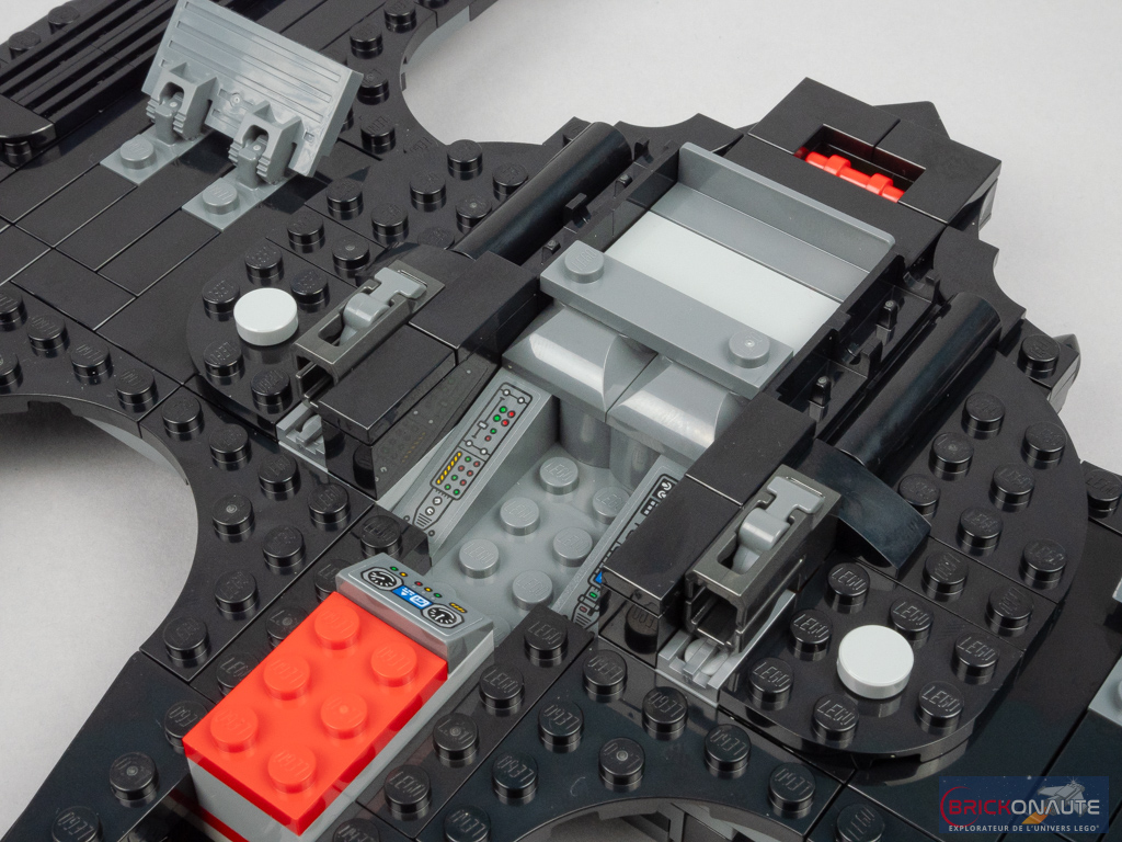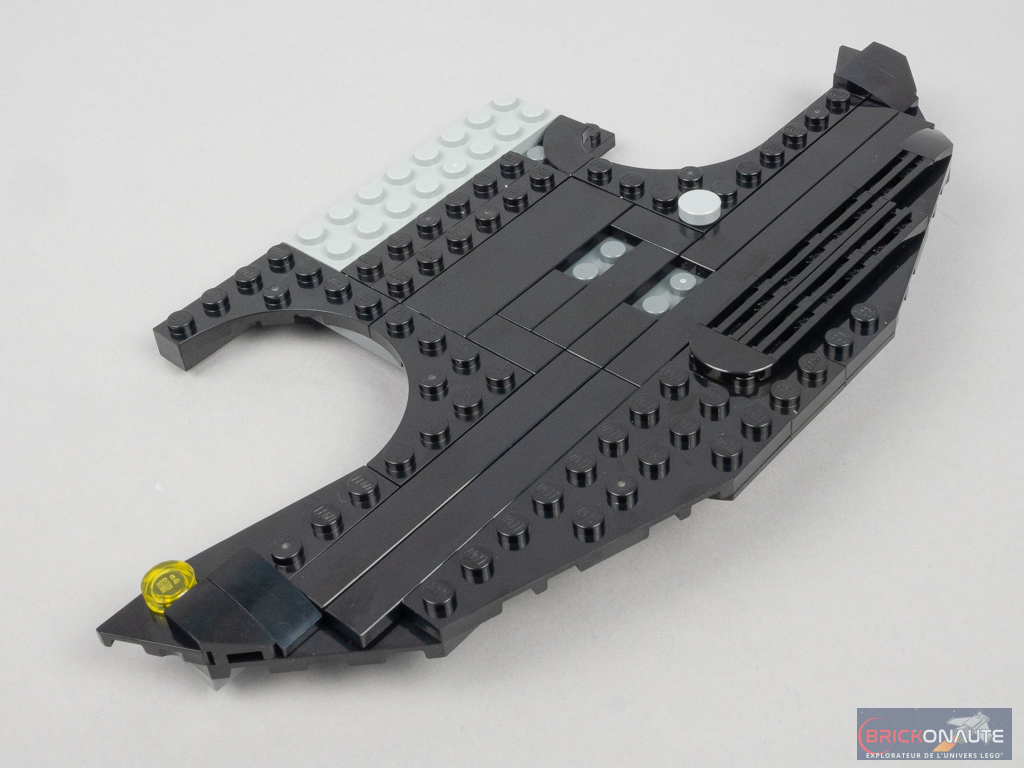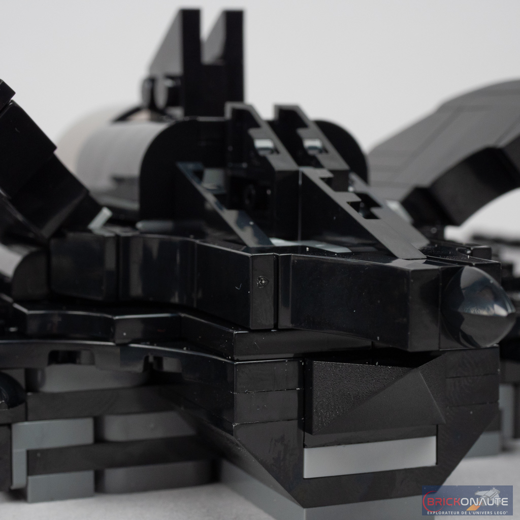 Côté extérieur, on trouve 2 volets orientables fixés sur des charnières, deux petites loupiotes jaunes, et un peu de détail sur les ailes avec quelques grilles. Les deux mitrailleuses sont ici remplacées par des stud shooters placés sur les côtés du cockpit. Pourquoi pas, et ça ajoute un peu de jouabilité. On retrouve évidemment les « ailes » de chauve-souris qui trouvent l’angle qu’il faut avec des charnières (gris clair – c’est dommage elles sont un peu visibles). Mention spéciale à la pointe située à l’arrière, c’est très bien fait et en plus, c’est intéressant à construire.