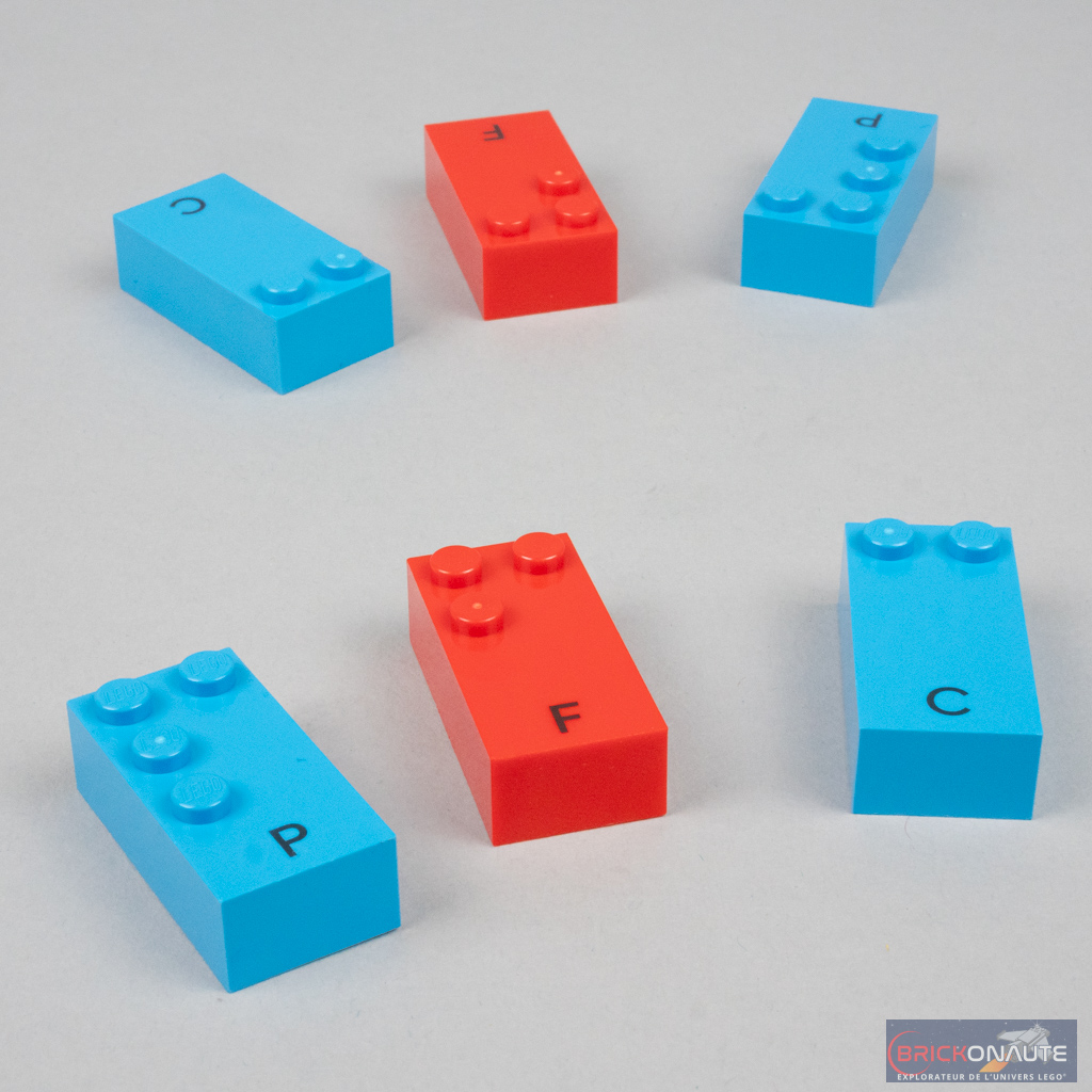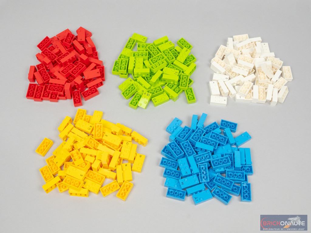 Les briques sont réparties en 5 couleurs, et sont toutes de la même taille : 2×4 tenons. Les 3 premières rangées de tenons servent à « transcrire » le caractère braille correspondant sur la matrice de 2×3, et le bas de la brique est tampographié avec la lettre / le chiffre / le symbole correspondant. Les briques sont évidemment compatibles avec le système LEGO et s’empilent comme n’importe quelle brique classique.