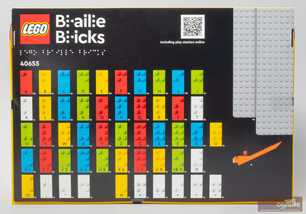 Au dos, on trouve l’inventaire complet du set avec ses 284 briques en braille, ses 2 plaques de base et un séparateur de briques. On ne trouve malheureusement aucune inscription en braille à l’arrière de la boîte. C’est de dos qu’on s’aperçoit de la différence majeure entre les deux versions du set : la version française est plus « riche » avec ses caractères accentués – on note également certaines différences notamment sur les opérateurs mathématiques.