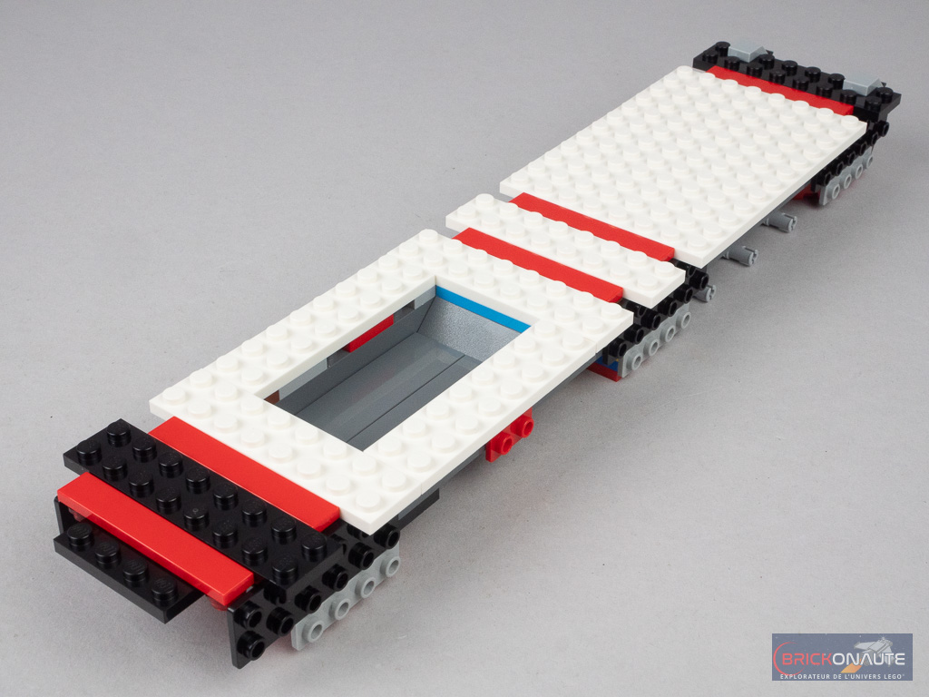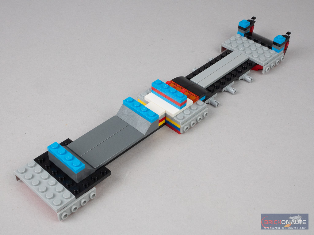 On continue avec la remorque, dont la construction commence logiquement par le châssis. Étrangement et malgré la longueur de l’ensemble, il ne s’agit pas d’une structure technic mais d’un assemblage de plates plus classique. On intègre les 3 essieux, et des clips à l’intérieur qui permettront de fixer les rampes lorsqu’elles ne seront pas déployées. Les deux côtés sont couverts de brackets qui serviront à la décoration des bas de caisse.