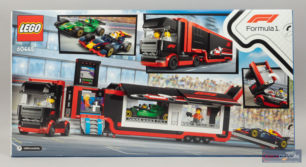 Au dos de la boîte, le camion vient de détacher sa remorque et les « volets » de cette dernière sont ouverts – les voitures sont en train d’être déchargées et une des minifigs s’entraîne sur le simulateur. On retrouve également 3 vignettes de détail.