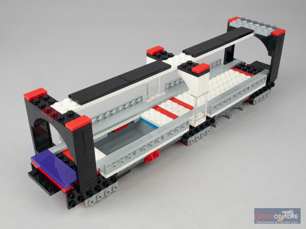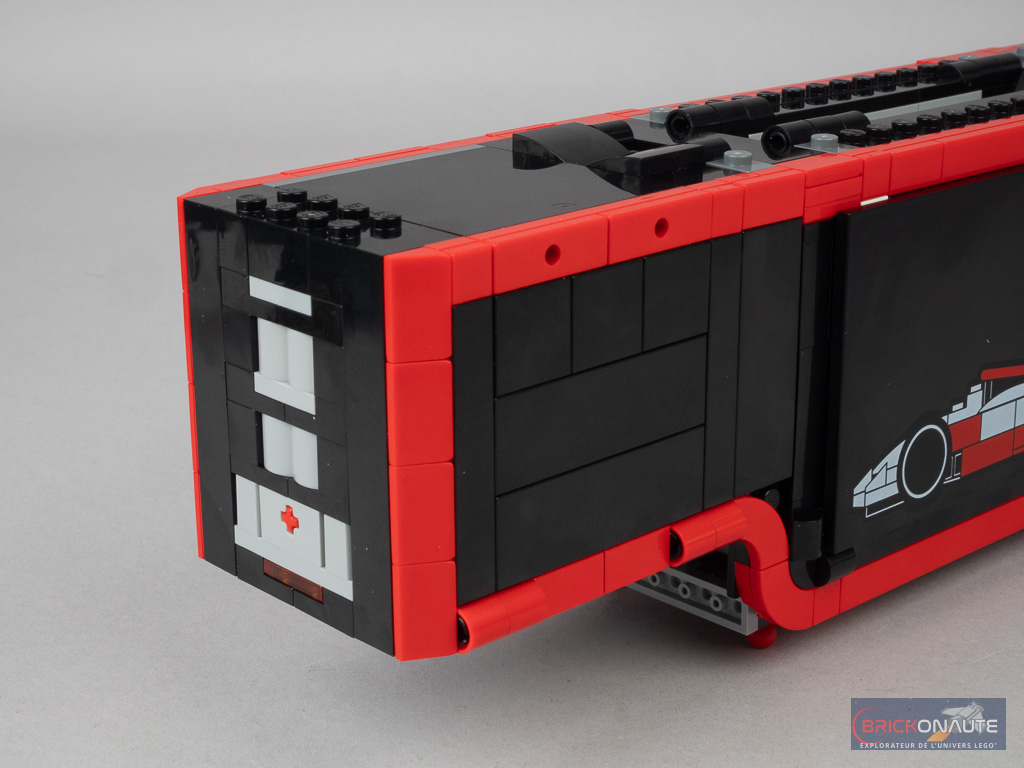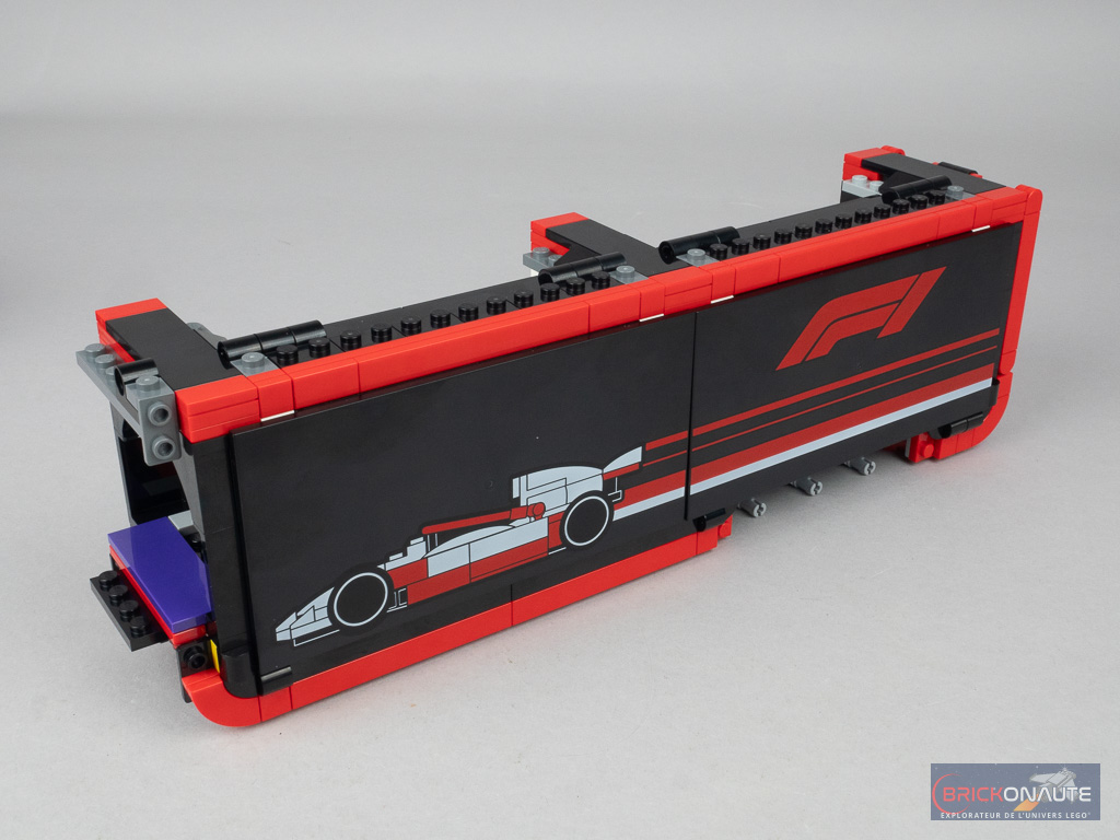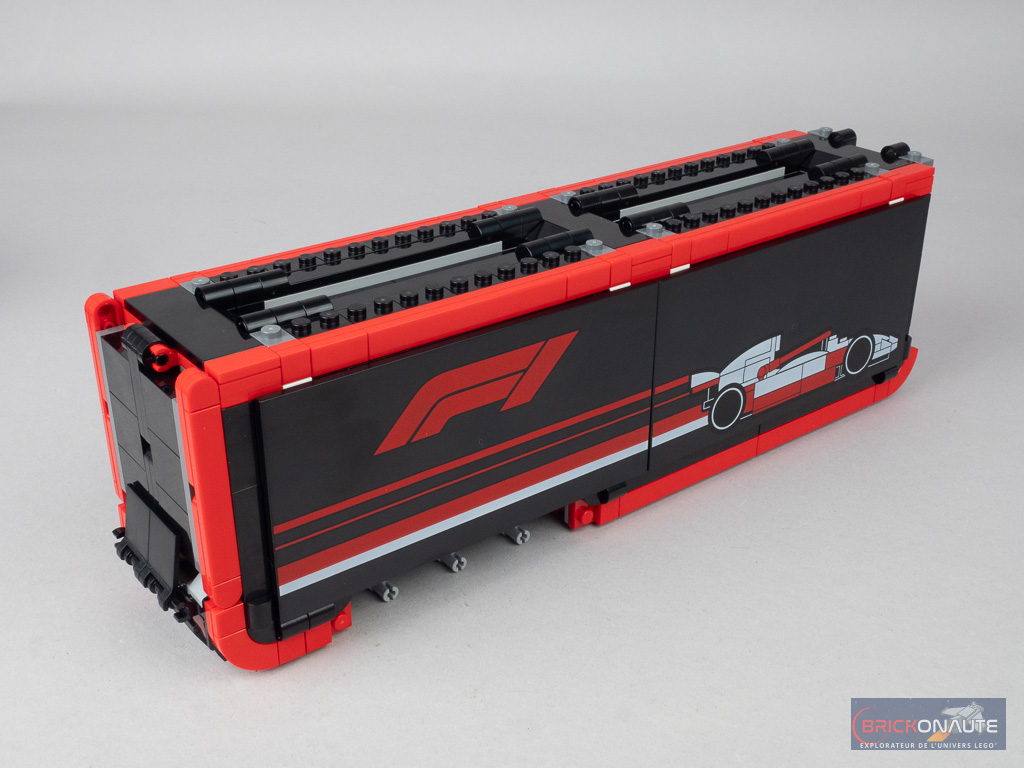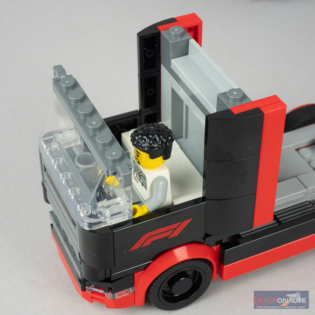 La cabine du camion se base sur un nouveau châssis monobloc de 4 x 14 tenons. On ajoute les passages de roues, un moteur factice et des clips à l’avant pour la fixation de la cabine. L’avant et l’arrière sont décorés grâce à des brackets, avec notamment un grand élément de 6×2 tenons à l’arrière. La cabine abrite un petit couchage, les portières ne sont malheureusement pas mobiles mais constituées de tiles tampographiées du logo F1. Les montants de la cabine sont décorés de quelques tiles et slopes rouges et noires, et la construction s’achève par un sous-ensemble amovible formant la « casquette » et le toit.