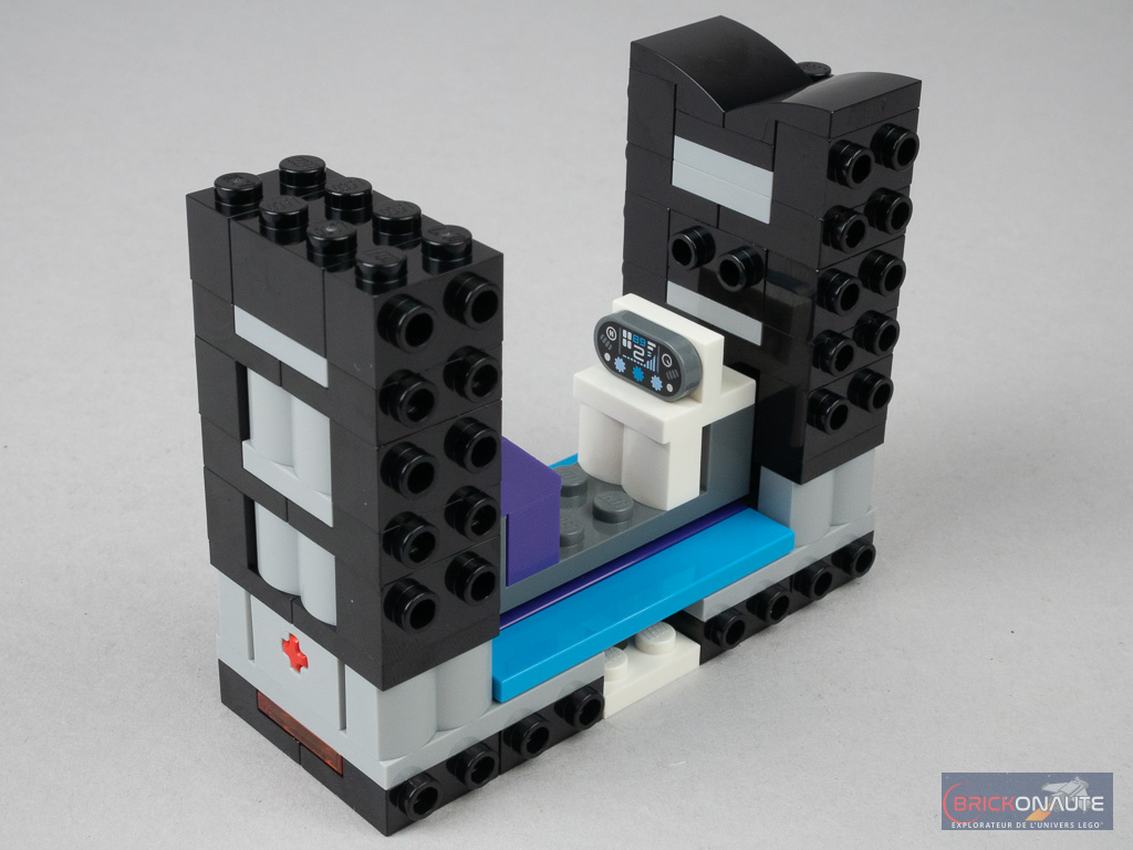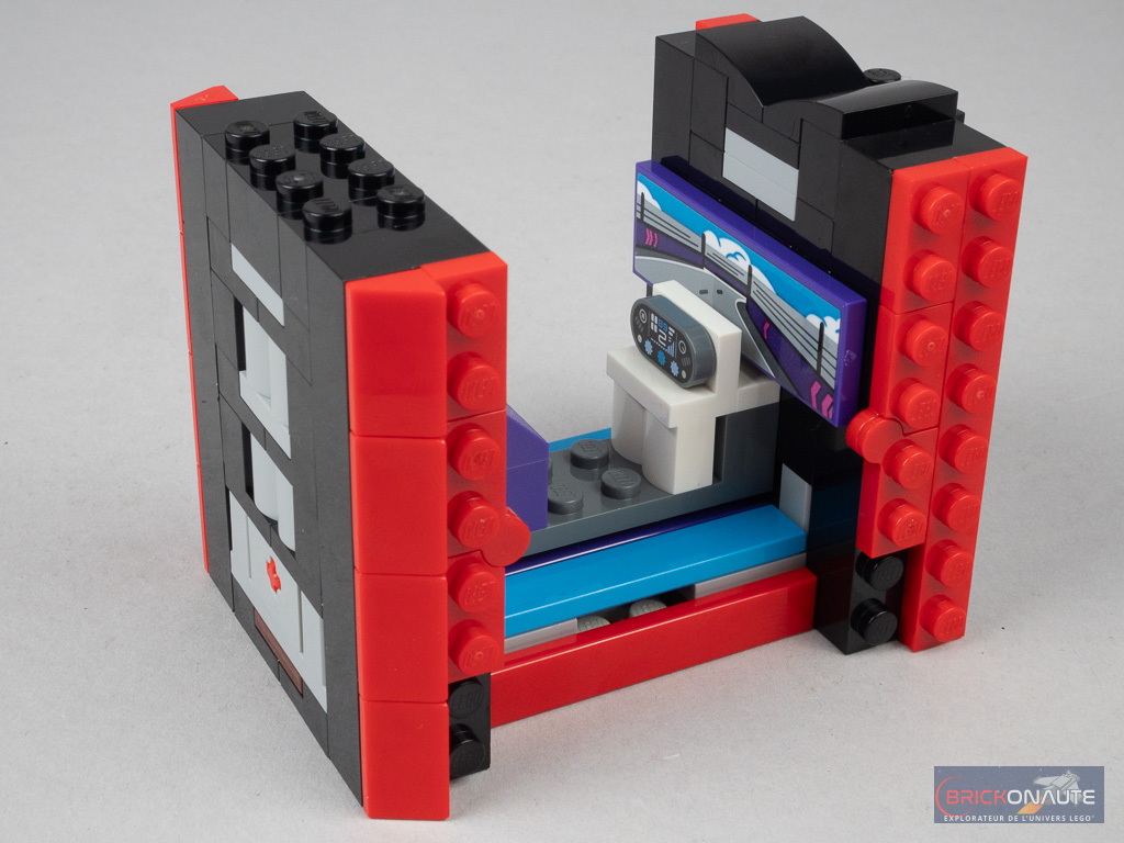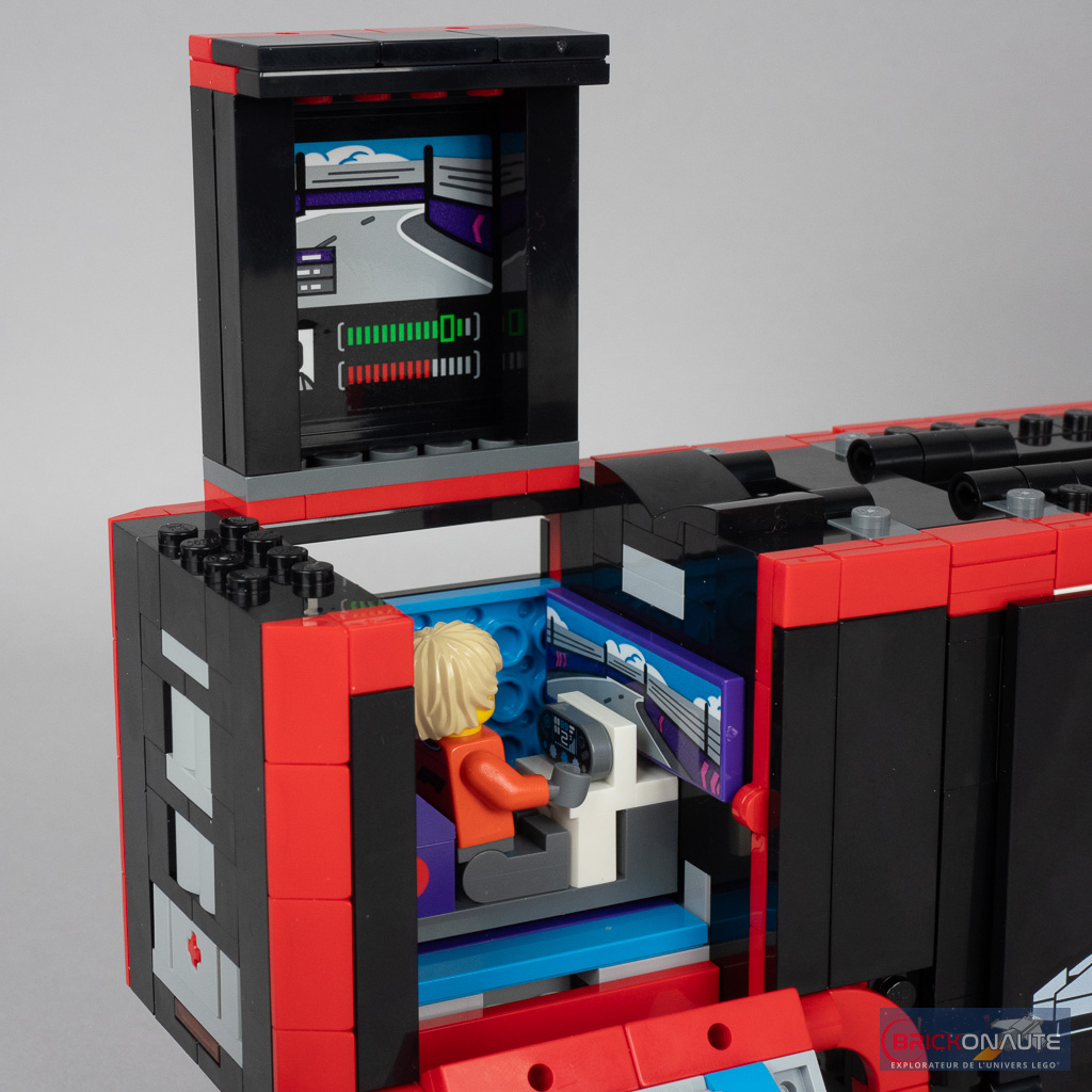 Les deux derniers sachets de pièces sont dédiés à la construction du simulateur, abrité sous la partie en encorbellement de la remorque. Le poste de pilotage est fixé à la structure via deux pièces souples et est donc légèrement mobile. Pour le reste, il s’agit d’une structure à base d’éléments SNOT et de deux ouvertures articulées sur des clips. La première permet de déployer un petit escalier, tandis que le seconde abrite un écran et se fixe en partie supérieure de l’ensemble. On attache ce grand sous-ensemble au reste de la remorque, on sécurise le tout, et on installe les roues ce qui achève la construction.