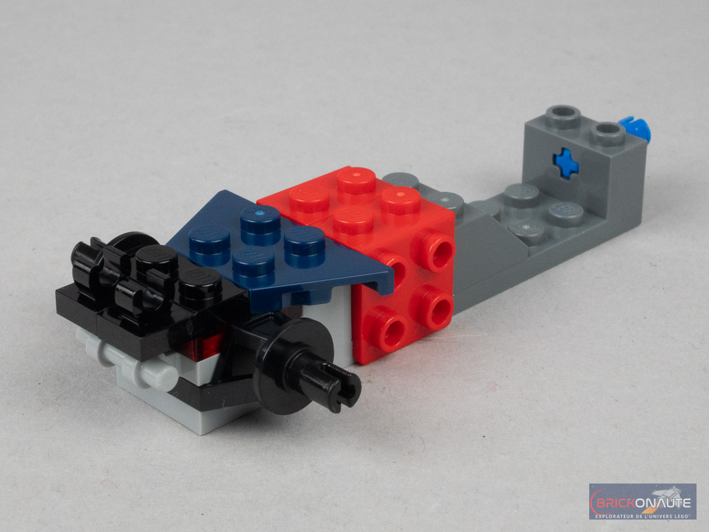 Deux demi-cylindres , une grande slope, et un aileron clipsé forment l’arrière de la machine. Quelques wedges et des petites cheese slopes forment la partie avant, raccordée au châssis par une grande slope tampographiée. Enfin, des brackets servent à fixer les parties latérales, formées de passages de roues placés à l’horizontale. On termine avec le halo formé d’une tige souple clipsée sur les côtés, et les 4 roues décorées d’une jolie tile tampographiée.