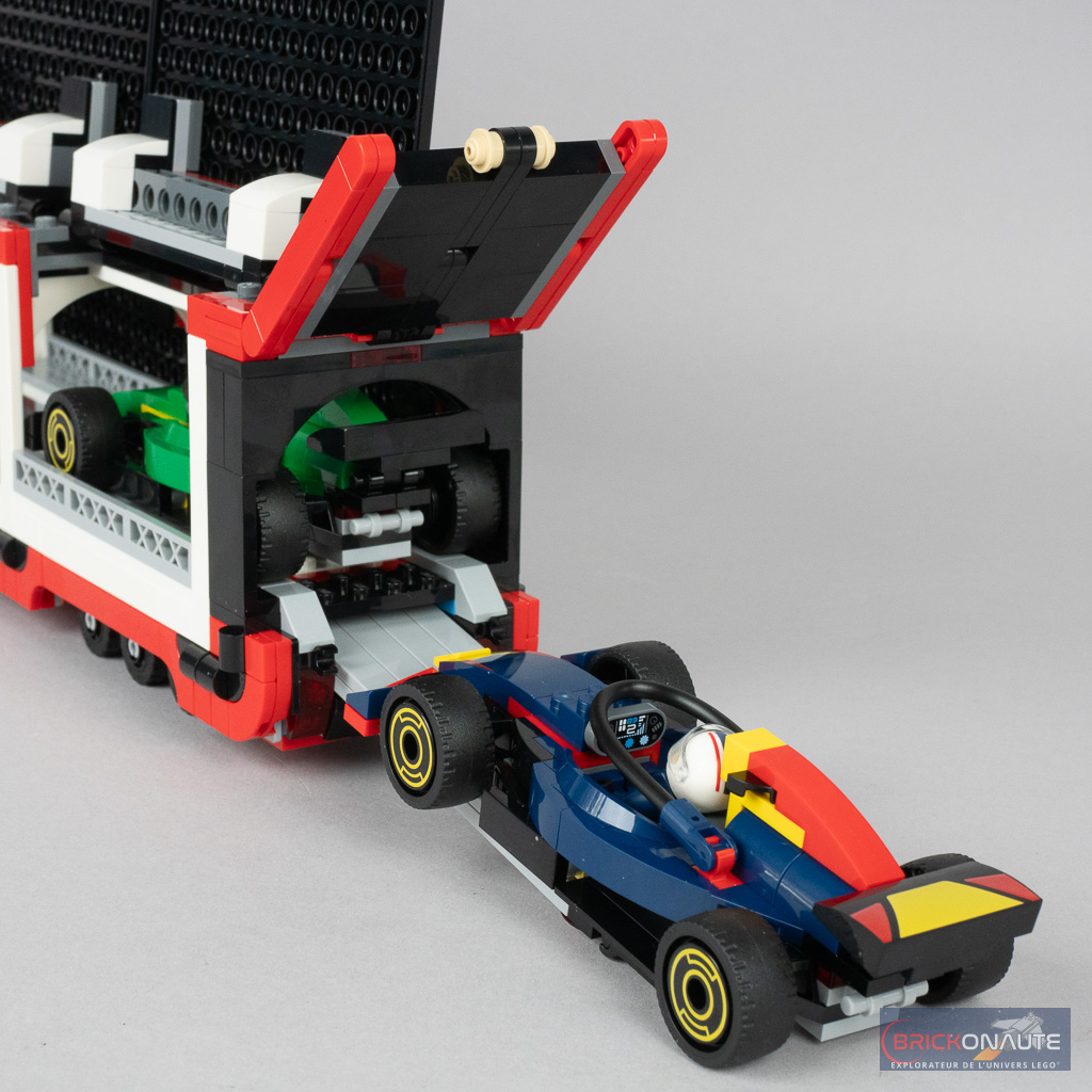 Le niveau de jouabilité est digne de ce qu’on attend d’un set de la gamme LEGO City portant la mention « 8+ ». Au-delà du fait qu’on dispose de 3 véhicules dont 2 F1 qui pourront permettre aux plus jeunes de se livrer à des courses acharnées, on notera plein de fonctionnalités intéressantes – au premier rang desquelles la possibilité de déployer une rampe à l’arrière de la remorque pour y charger les deux voitures. Elles seront alors visibles en ouvrant les grandes « portes » latérales de la remorque.