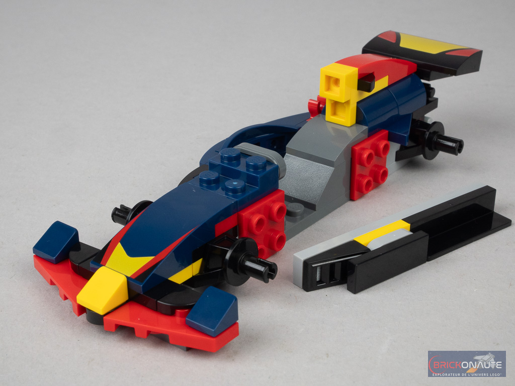 En prenant les livrets dans l’ordre, on commence par la voiture Red Bull RB20 qui correspond au premier sachet de pièces. La conception des voitures est astucieuse, et intègre de nouveaux essieux permettant de conserver la « finesse » de ces machines. Le châssis est constitué d’un grand essieu servant habituellement dans la gamme LEGO Speed Champions, placé cette fois-ci dans le sens de la longueur.