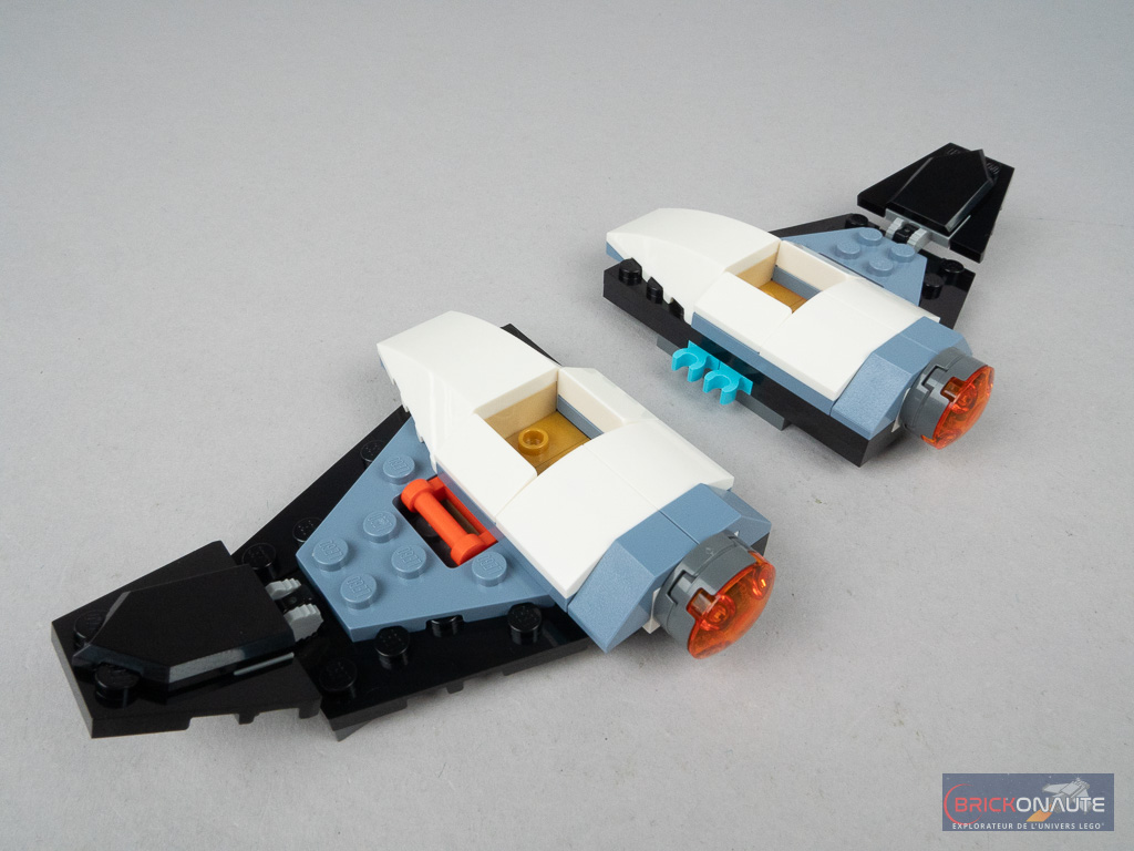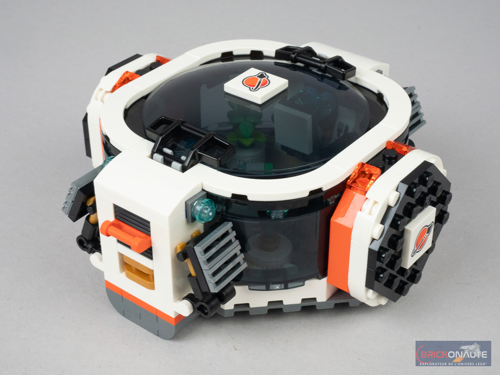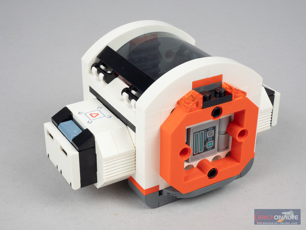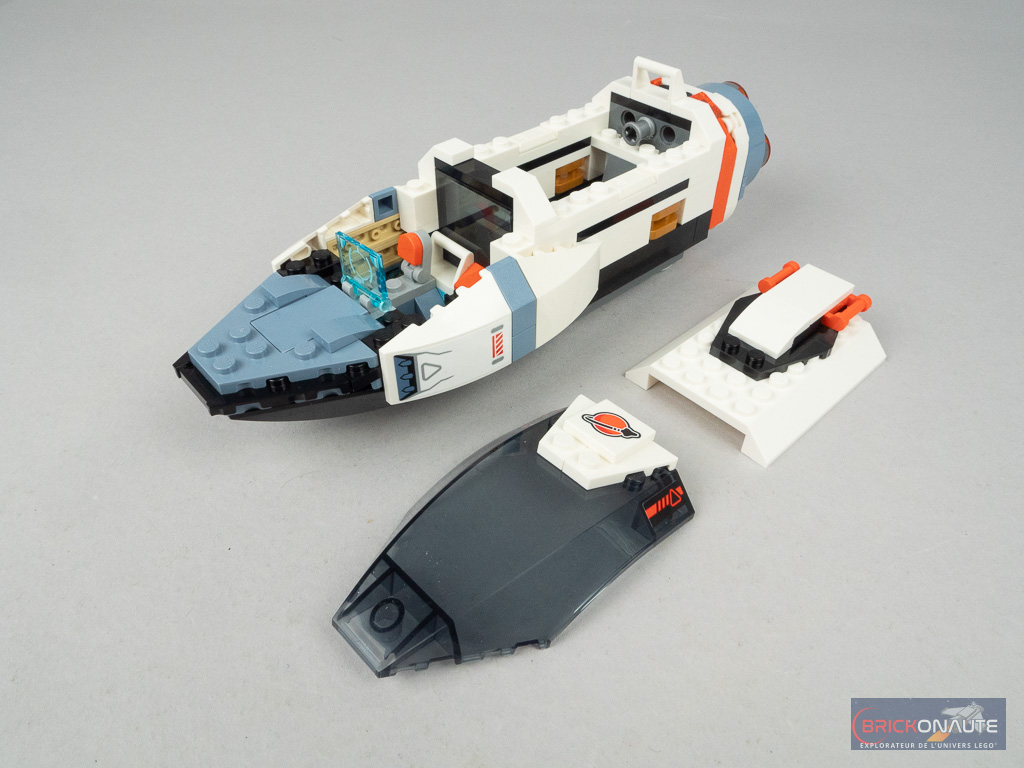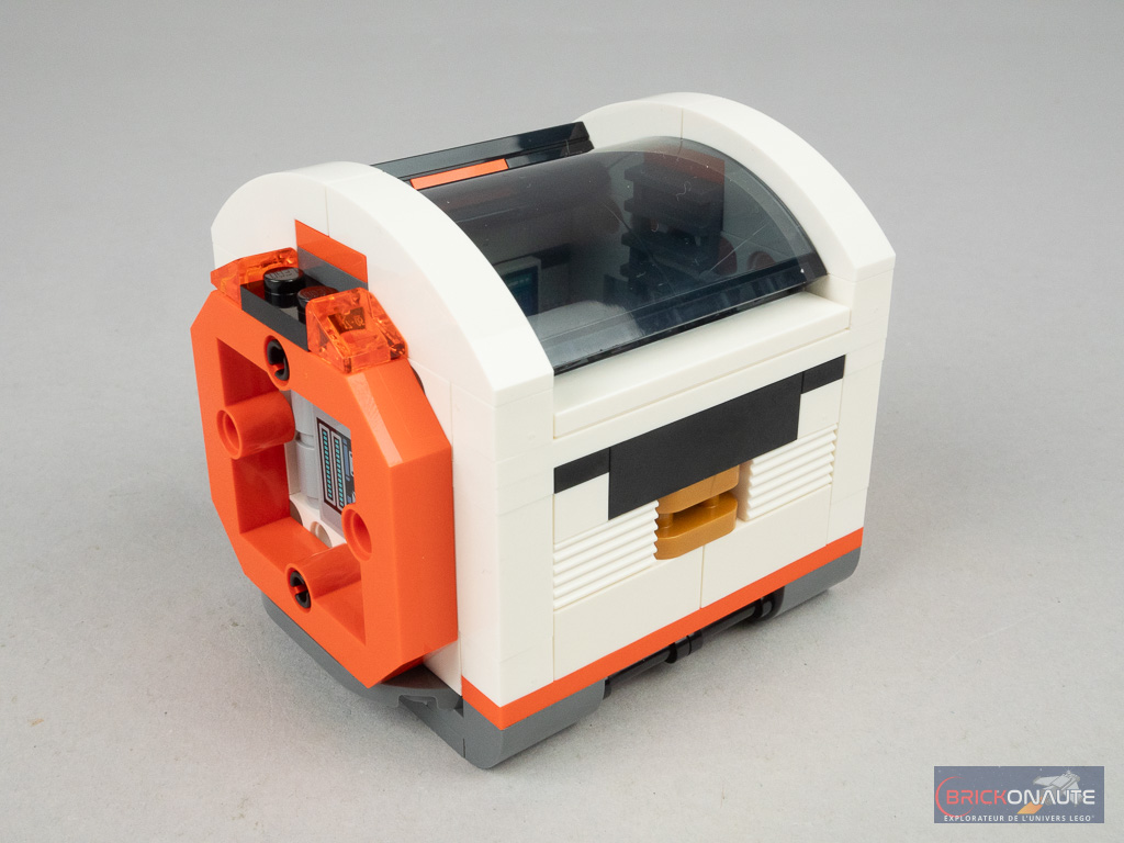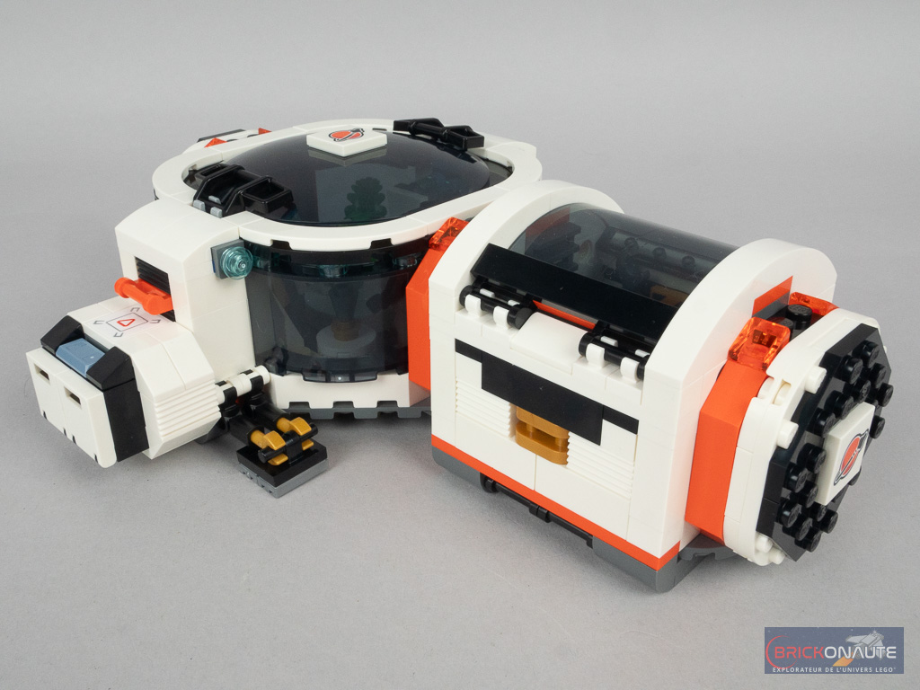 Il s’agit des pièces qui permettent de lier les différents modules entre eux grâce à quelques pins Technic et dans ce cas précis, ils servent à détacher la partie vaisseau du module central et du laboratoire. Et ainsi imaginer la mission du vaisseau d’aller déposer ce laboratoire sur une planète lointaine, avant de continuer son exploration. Les ailes et les petits coffres sur les côtés sont clipsés et peuvent être attachés à chacun des 3 modules principaux. Notez aussi que le laboratoire dispose de 4 trains d’atterrissage déployables.