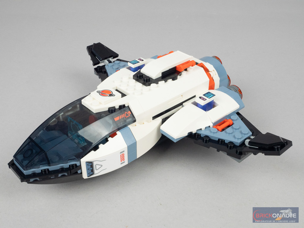 Et c’est un set plutôt sympathique, qui devrait plaire aux jeunes fans de la conquête spatiale. Le design est résolument celui d’un jouet et ne prétend aucunement être fidèle à quelque engin que ce soit. On y retrouve malgré tout les « attributs » qui en font un vaisseau spatial et qui l’identifient immédiatement comme tel avec son cockpit, sa forme allongée, ses ailes et ses réacteurs. Pour ceux qui se poseraient la question, il est tout à fait possible de le positionner à la verticale.