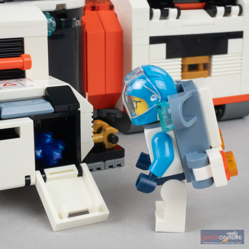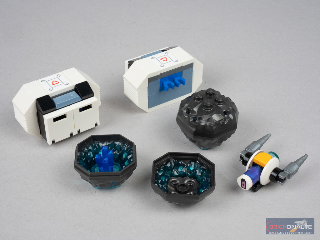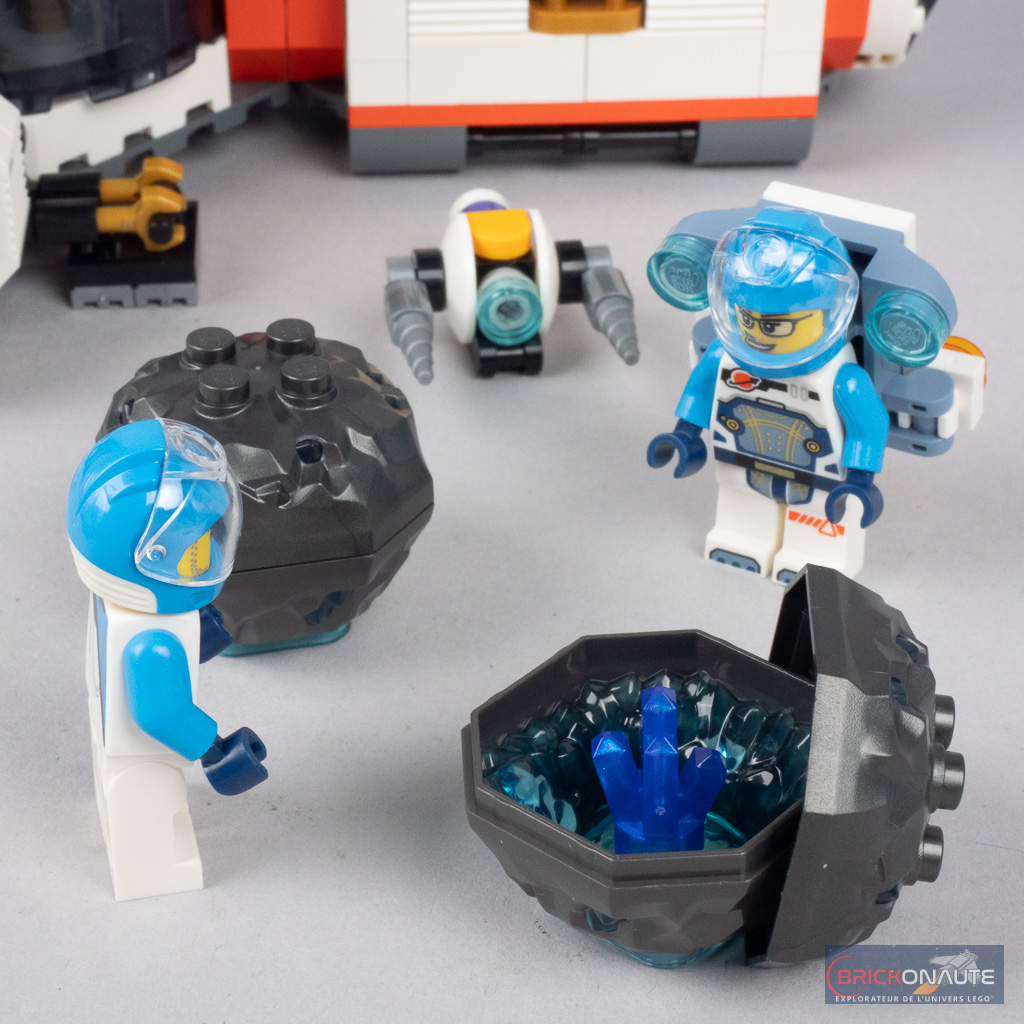 Quelques accessoires sont également prévus pour rester à l’extérieur avec un petit robot d’exploration et deux astéroïdes décomposées en 2 « coques » et renfermant un cristal violet que les astronautes pourront récolter avant de les placer dans les coffres latéraux du vaisseau pour pouvoir les analyser.