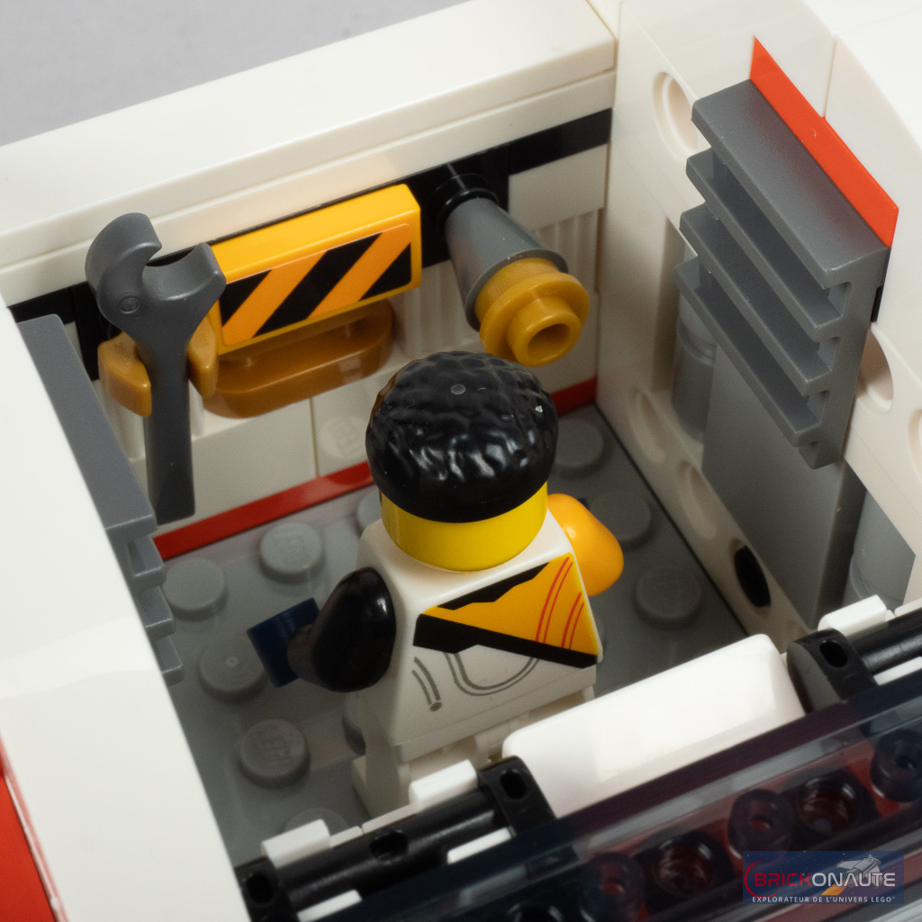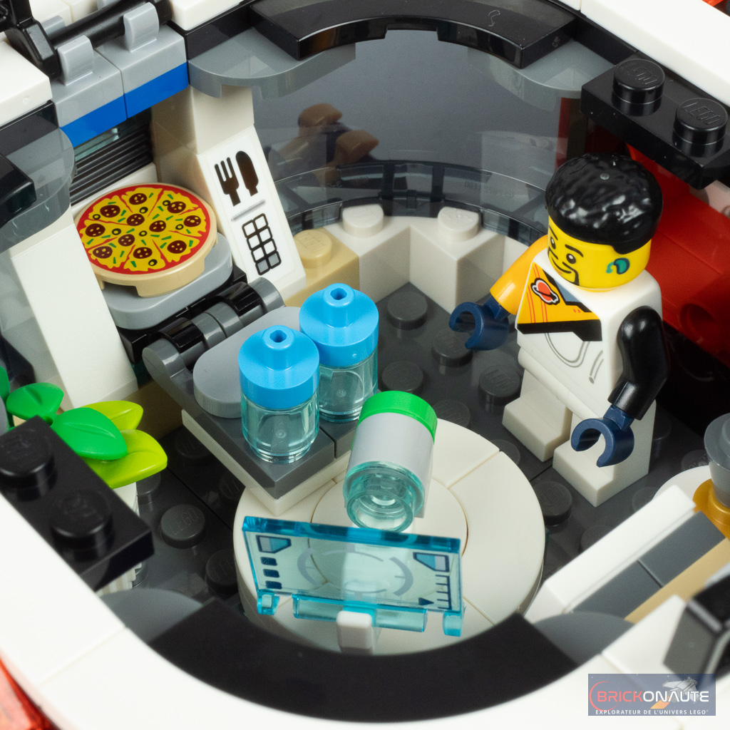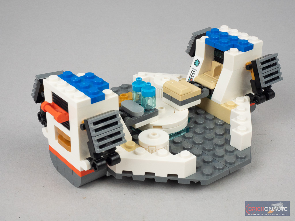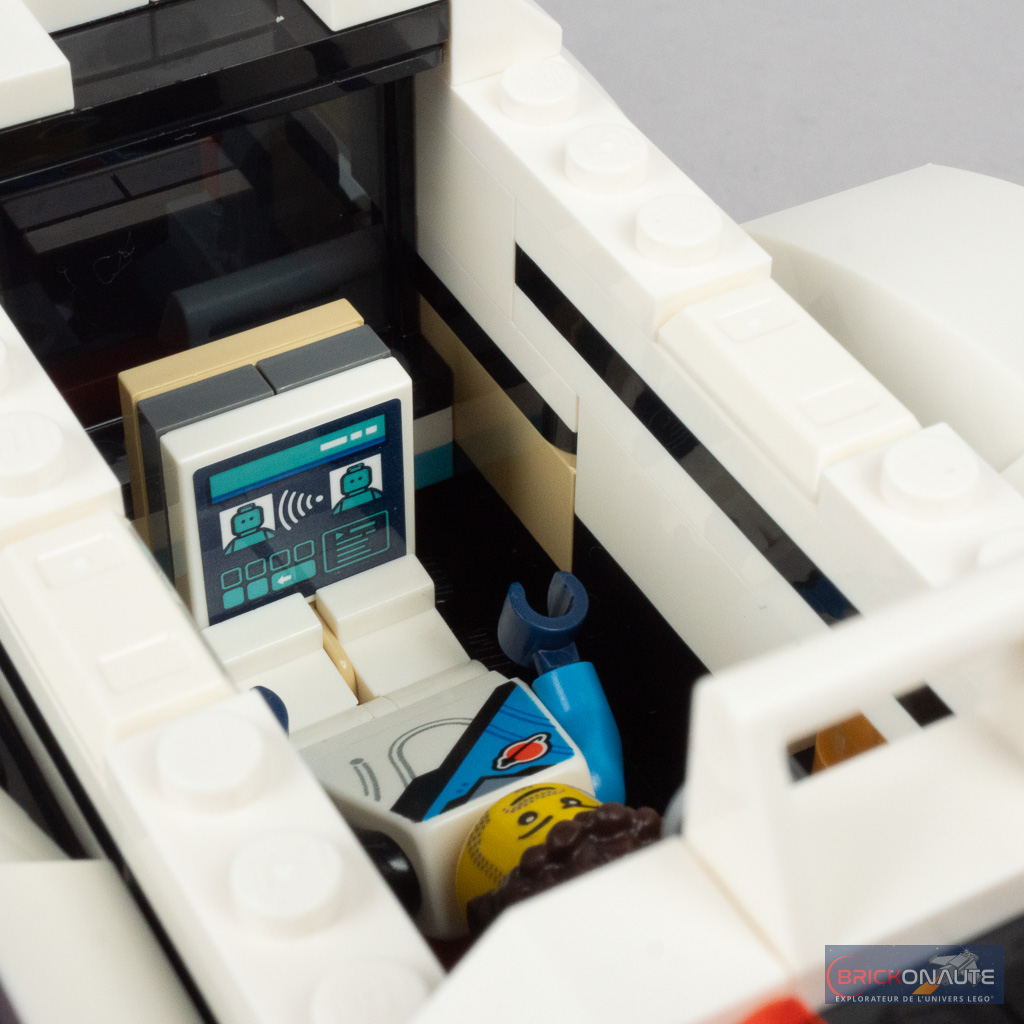 Tout dans ce set est au service du jeu, et les intérieurs détaillés regorgent d’accessoires pour multiplier les mises en scène. La soute du vaisseau abrite ainsi un module de commande, la partie centrale une sorte d’atelier, et la partie arrière un grand laboratoire avec tout plein de choses à examiner. On peut également y déployer une petite table avec quelques boissons et une pizza, ou une couchette supplémentaire.