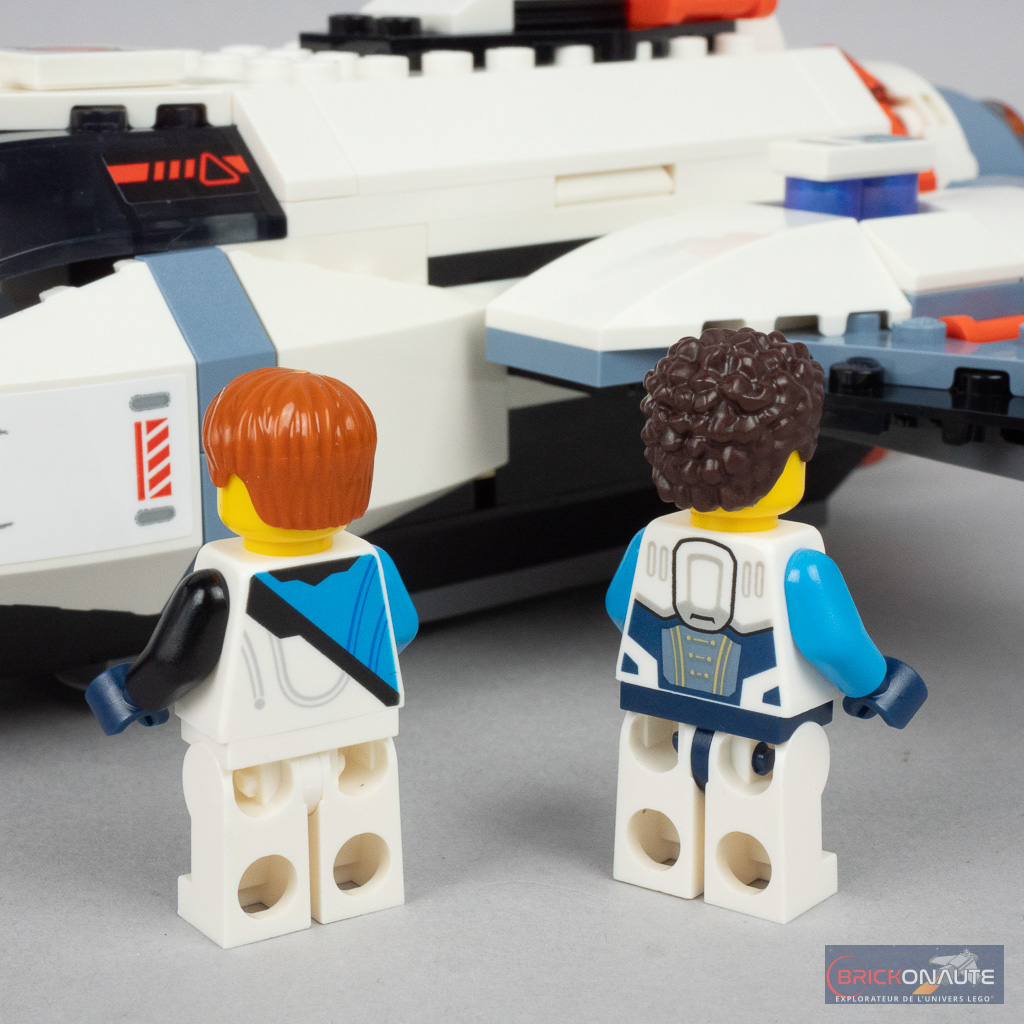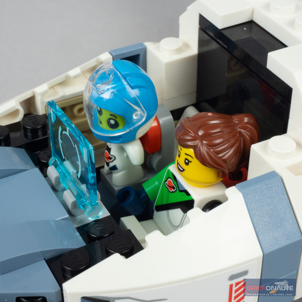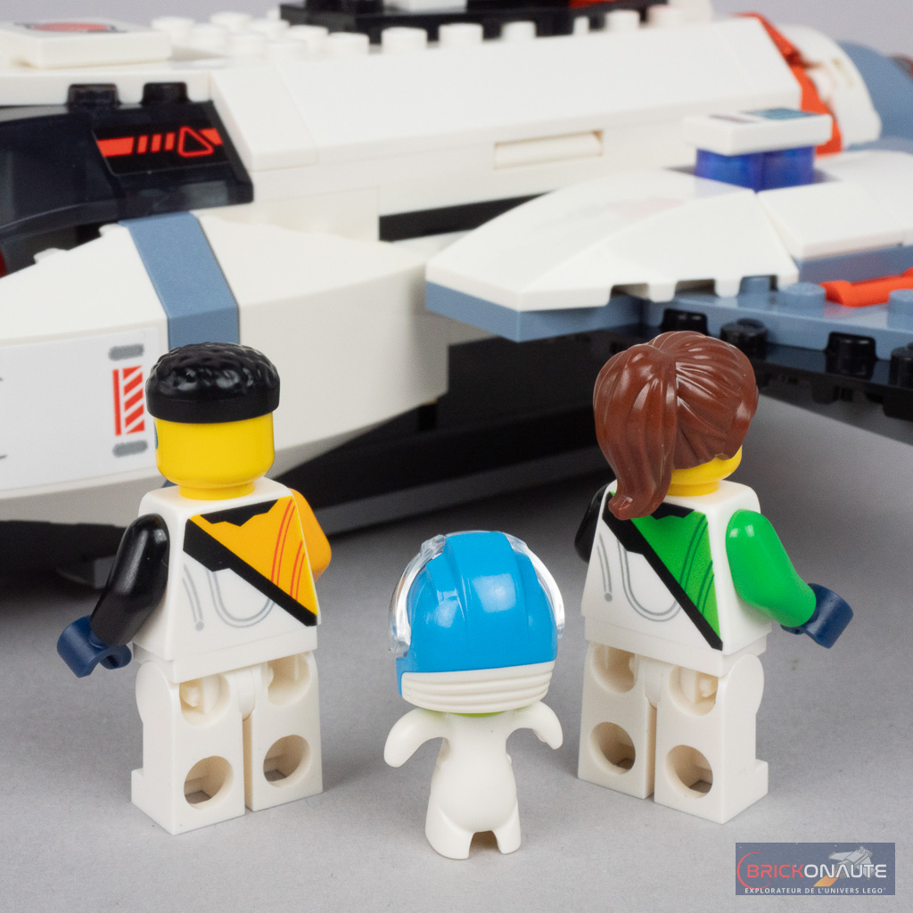 Pour ne rien gâcher, on trouve également dans cette boîte un total de 4 minifigs, dans des tenues toutes différentes les unes des autres (et inédites pour 3 d’entre elles) et un petit alien pour leur prêter main forte. Détail rigolo, le cockpit du vaisseau dispose d’ailleurs d’un siège spécifiques pour ce passager particulier.