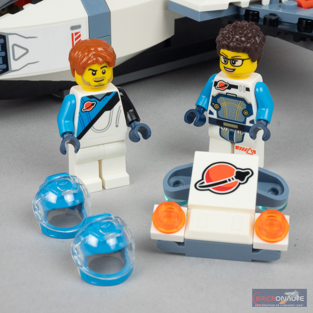 Tous les astronautes ont un casque de couleur assortie à leur combinaison – on remarquera même 3 designs de casques différents, tous présents dans cette gamme LEGO City « Space » depuis début 2024. Du côté des accessoires notables, on remarquera surtout l’énorme jetpack sand blue affecté à l’astronaute en charge d’explorer. Notez également que les 4 personnages disposent d’une coiffure alternative.