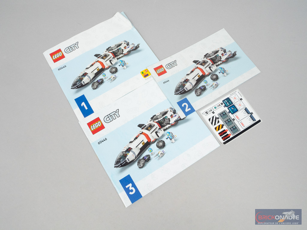 Sur la face avant de la boîte, reprenant le bandeau Space argenté vu dans plusieurs gammes pour ces sets thématiques, notre gros vaisseau navigue dans l’espace tandis qu’un astronaute et un petit robot inspectent les astéroïdes alentours. En arrière-plan, on devine la station spatiale du set 60433 Modular Space Station sorti début 2024. Au dos, le vaisseau est séparé en 2 morceaux : la partie laboratoire est posée sur la surface d’un astéroïde et le petit vaisseau, reconfiguré, part en exploration. Un schéma nous montre la modularité du modèle, et 3 vignettes insistent sur quelques détails.