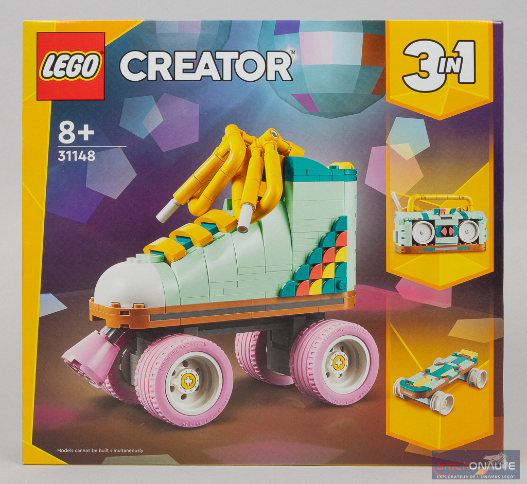Avec un « patin à roulettes rétro » comme LEGO l’appelle officiellement, il est plutôt logique que la boîte arbore un look rétro également : le patin à roulettes et ses roues roses nous est présenté sur un fond coloré qui sent bon les années 80, sur ce qui semble être la piste de danse d’un club à en juger par la boule à facettes. Les deux modèles alternatifs, un radiocassette et un skateboard, nous sont présentés sur le côté droit. Au dos, on retrouve une vue sous un autre angle de ces 3 modèles.
