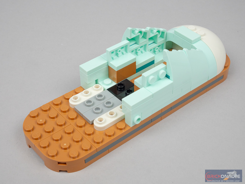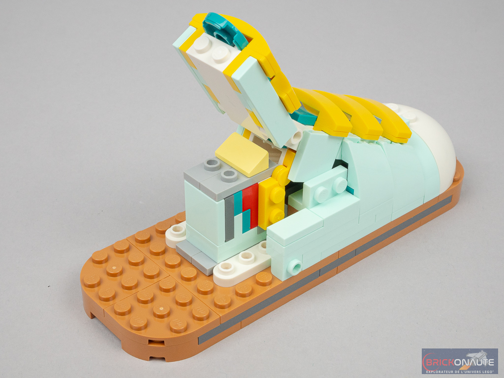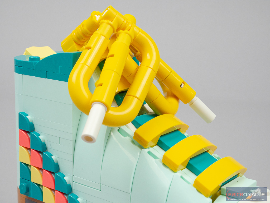 Un petit mot rapide sur la construction pour en finir avec ce premier modèle. L’expérience de construction proposée est souvent le point fort des sets de cette gamme LEGO Creator 3in1. Et ce set ne déroge pas à la règle, c’est franchement sympa à assembler, qu’il s’agisse des techniques de construction proposée ou de la manière de réutiliser certains éléments LEGO de manière différente – ici les connecteurs Technic pour les lacets, par exemple.