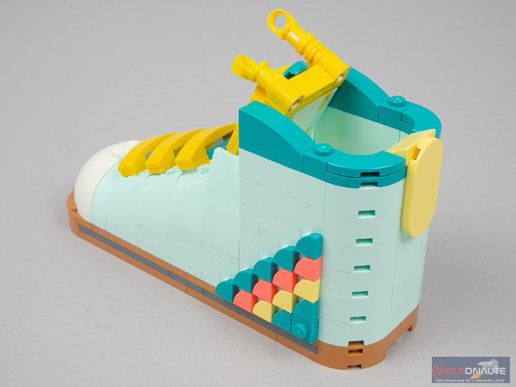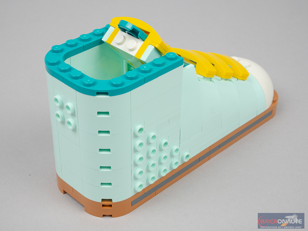 On construit ensuite la languette : deux sous-ensembles où sont fixés les slopes jaunes pour les lacets, sur des petits brackets. Cette languette se fixe sur un troisième sous-ensemble articulé sur deux charnières, fixé sur la semelle. La partie avant de la languette vient alors s’insérer sous les slopes situées sur l’avant de la chaussure. On construit alors l’arrière, simple superposition d’éléments aqua dont des briques macaroni qui viennent fermer l’ensemble.