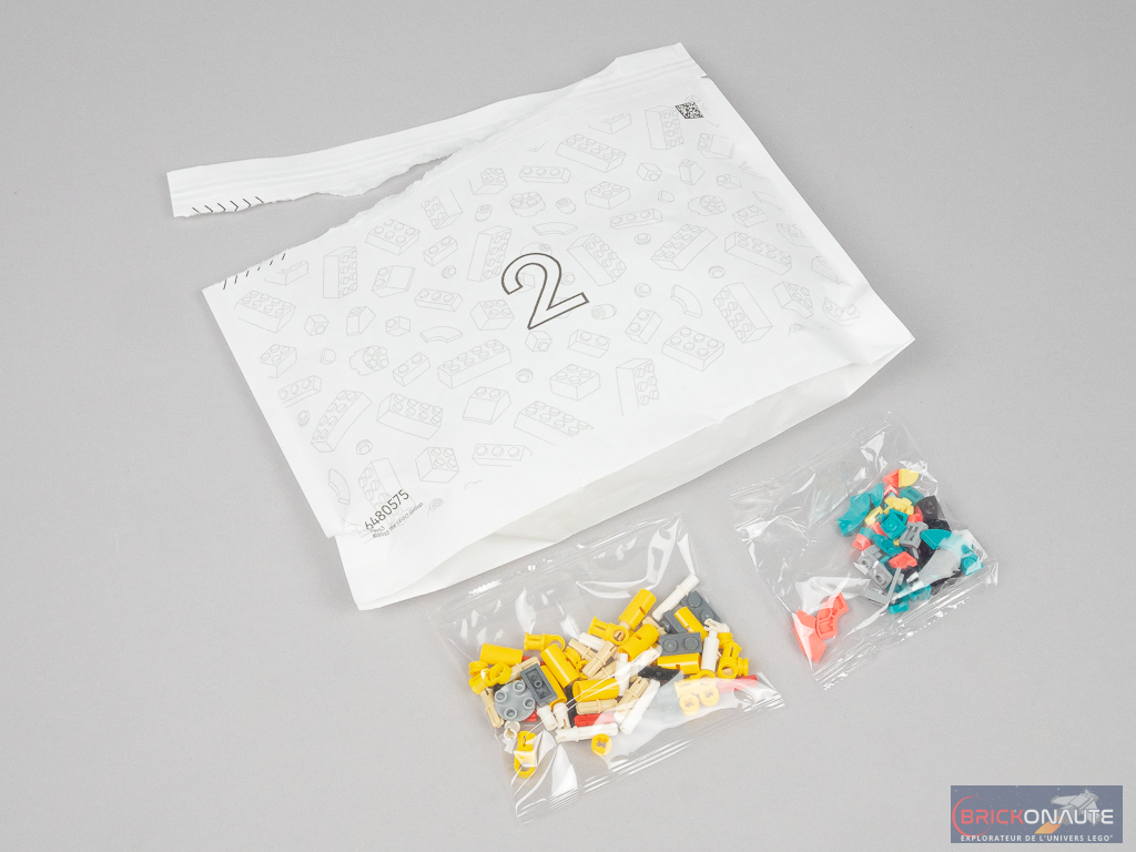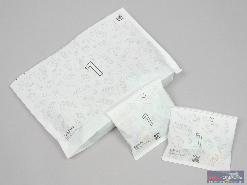 À l’intérieur de la boîte on trouve deux sachets numérotés… en papier ! Il était temps, depuis que LEGO communique sur le sujet. Hormis les pièces spéciales des différents sets LEGO Jurassic Park (qui sont fournies dans des sachets papier de couleur brune et non numérotés), c’est la première fois que j’en trouve. La transition est en marche. Les petits sachets intérieurs sont également en papier, et numérotés – du moins pour le numéro 1. Enfin, on obtient 3 notices d’instructions, une par modèle.
