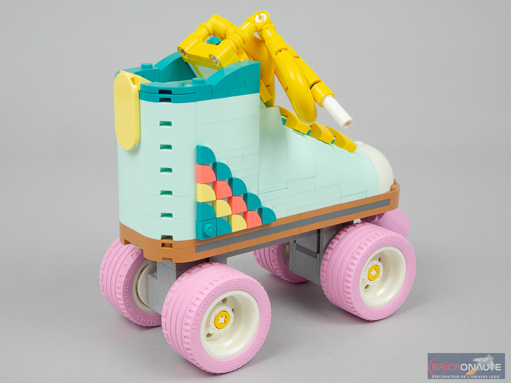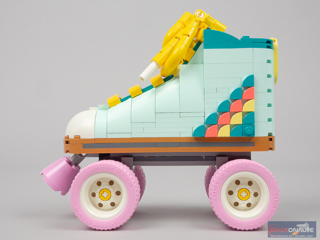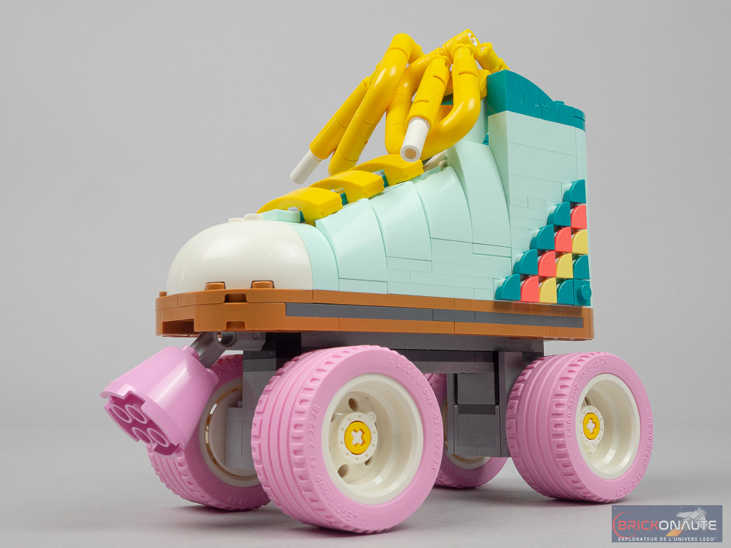 Première remarque lorsque la construction est terminée : contrairement à ce que peuvent faire penser les visuels officiels, le patin est plutôt petit : 14cm de haut pour 16cm de long et 7cm de large, lacets et frein inclus. La chaussure ne fait que 6 tenons de large, soit un peu moins de 5cm. Deuxième remarque : si LEGO traduit le nom de son produit par « les patins à roulettes rétro », il n’y a bien ici qu’un seul patin à construire.