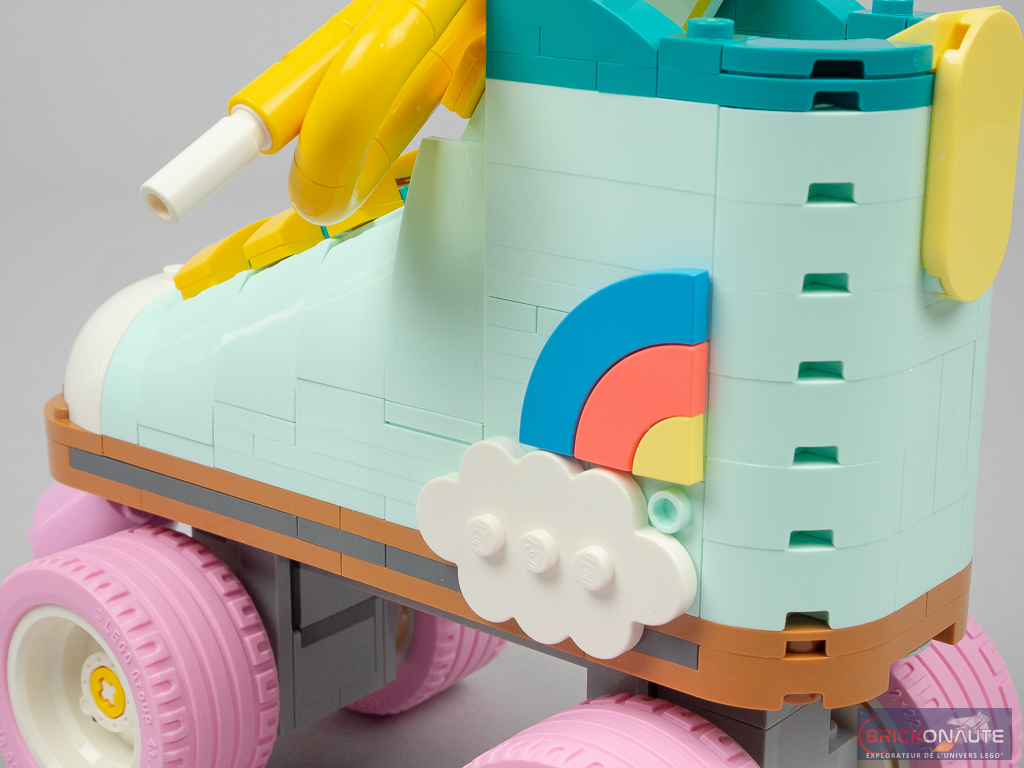 On décore ensuite cette partie du patin avec une multitude de petites tiles colorées, et on ajoute deux connecteurs Technic en haut de la languette pour y fixer les lacets. On construit alors la structure inférieure du patin, le frein rose étant fixé sur un connecteur gris. Les lacets consistent en deux sous-assemblages identiques à base de connecteurs jaunes. On termine avec les 4 roues, connectées au patin par des pins. LEGO fournit également les pièces pour modifier la décoration à l’arrière du patin si on le souhaite, avec un petit nuage.