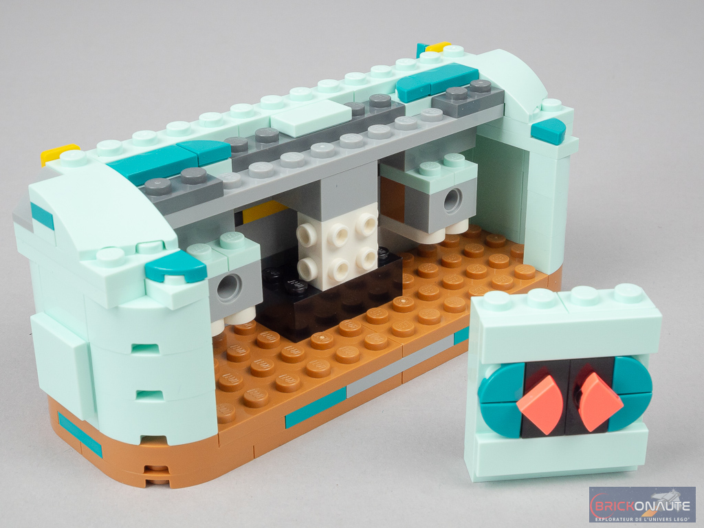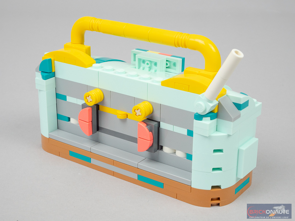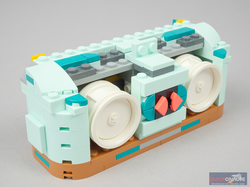 On reste bien dans le thème « années 80 » avec ce radiocassette, même si je doute qu’à l’époque ils pouvaient arborer de telles couleurs. La finition est en revanche assez moyenne avec des angles saillants et beaucoup de tenons exposés – il était possible de faire mieux avec l’inventaire disponible, rappelons que ce modèle ne réutilise que 55% des pièces du set.