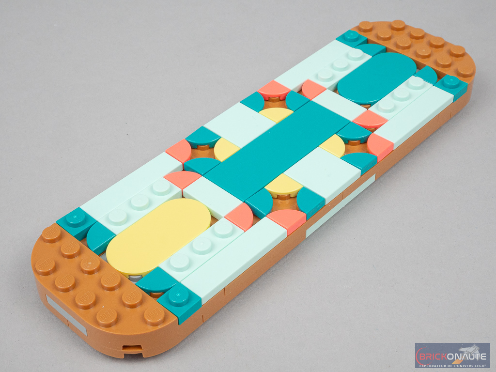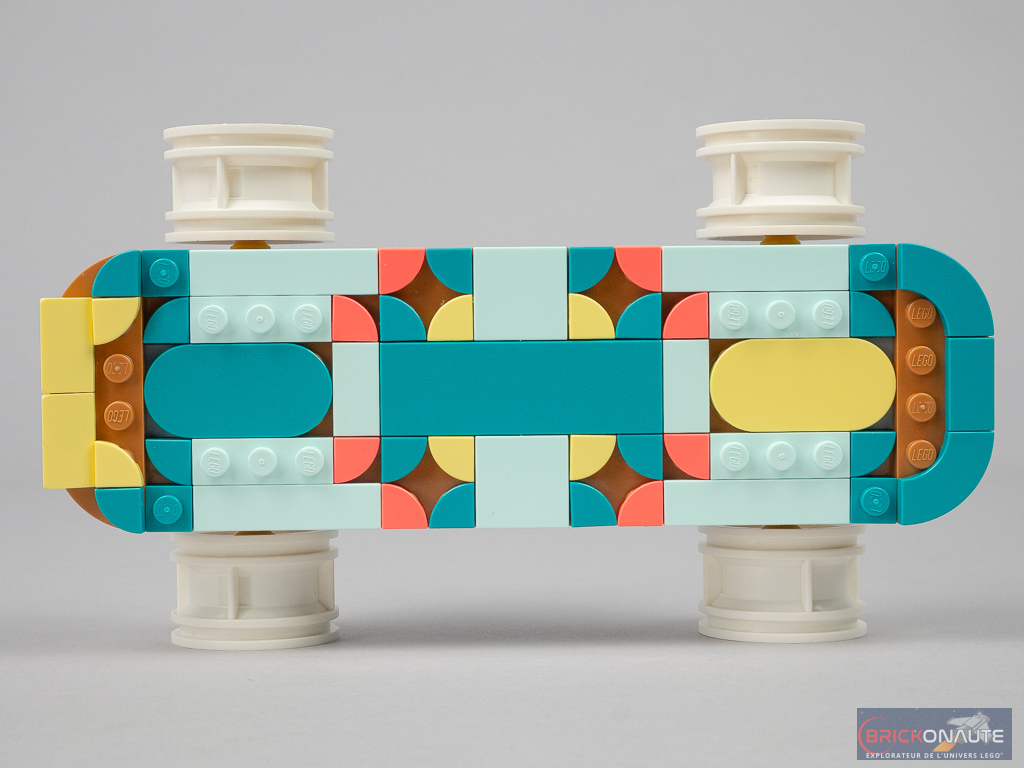 Cette fois-ci, la base est un peu plus longue que la semelle du patin – 20 tenons de long soit environ 16cm. Le processus de construction se limite ici essentiellement à décorer cette planche de tiles et plates colorées, qu’on essaiera d’aligner au mieux pour avoir un rendu digne de ce nom. On termine avec la structure inférieure et ces quelques éléments Technic qui permettent la fixation des roues, ici sans les pneus roses.