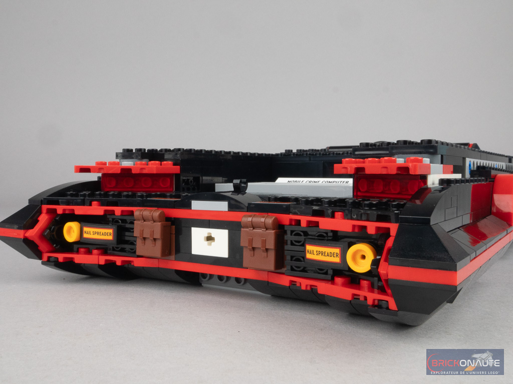 Il ne reste alors qu’à ajouter les roues, quelques sous-ensembles fixés « à l’envers » pour achever le bouclier avant, le réacteur arrière (attaché sur un axe Technic) et deux grands sous-ensembles pour achever les bas de caisse, et la construction est terminée. Il ne manque qu’à construire le petit support d’exposition pour Batman et la tile signalétique avec un énorme autocollant – n’hésitez pas à utiliser du produit à vitre si vous avez du mal à le placer correctement !